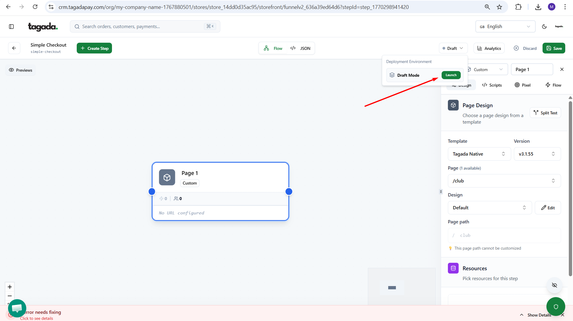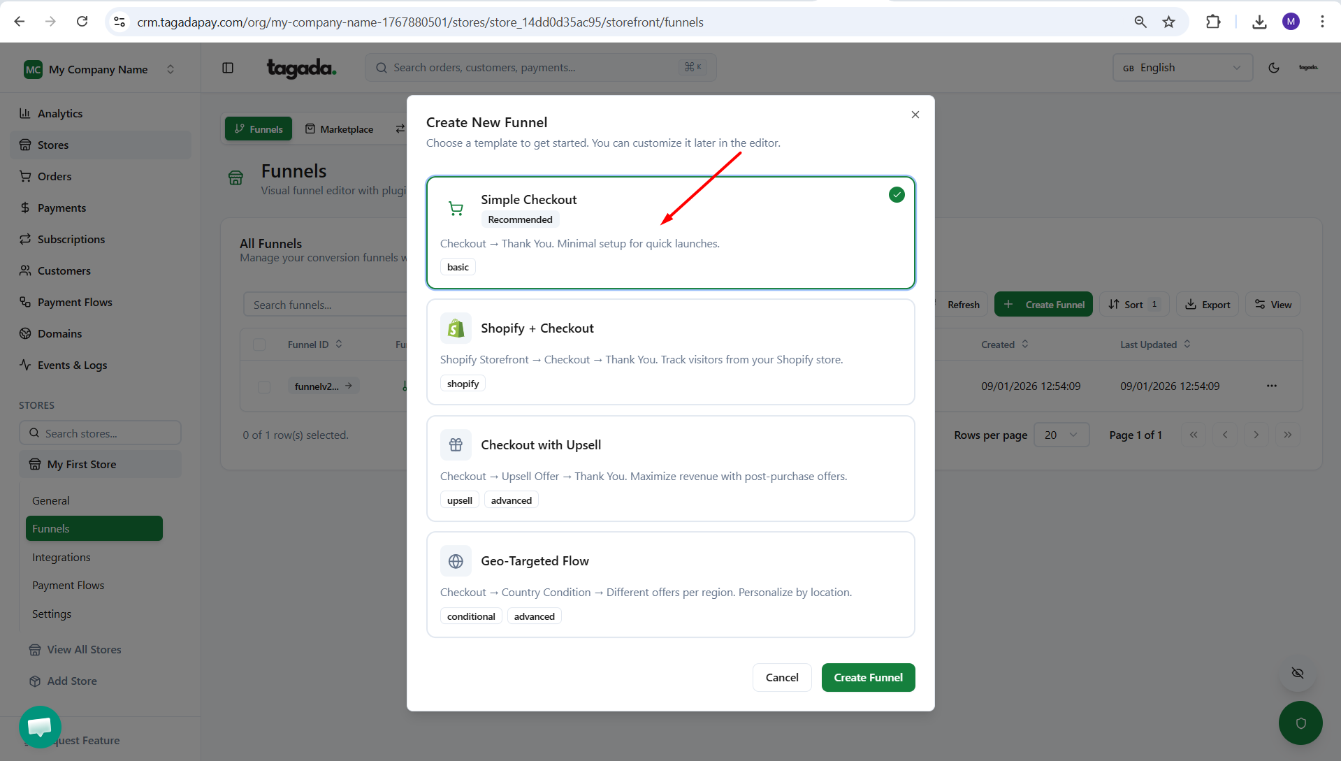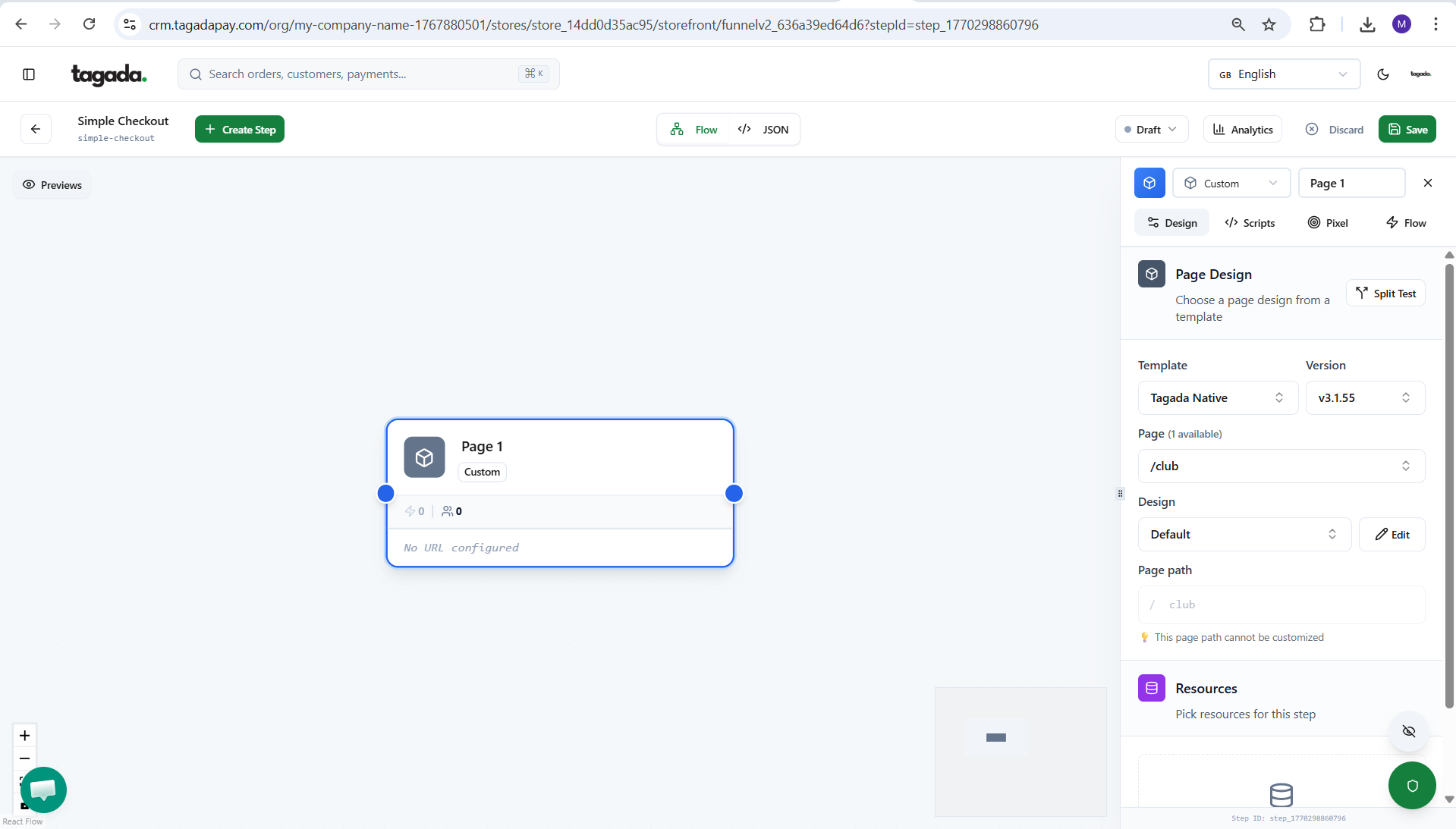 A new funnel with only one custom page → select Tagada Native, it will automatically configure the club