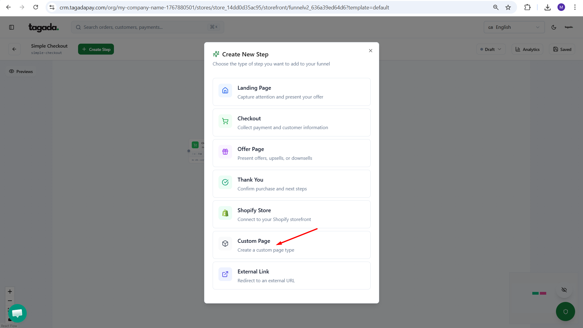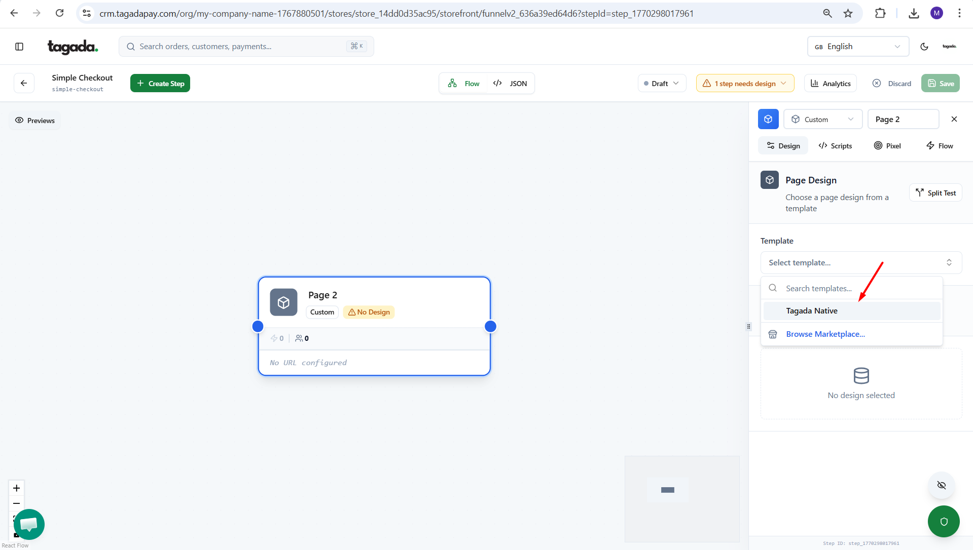 Click on the Custom Page box and on the right side menu select template Tagada Native.