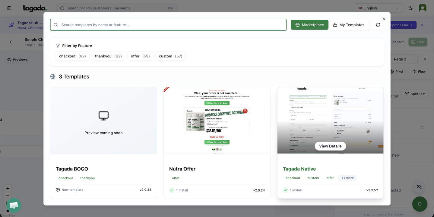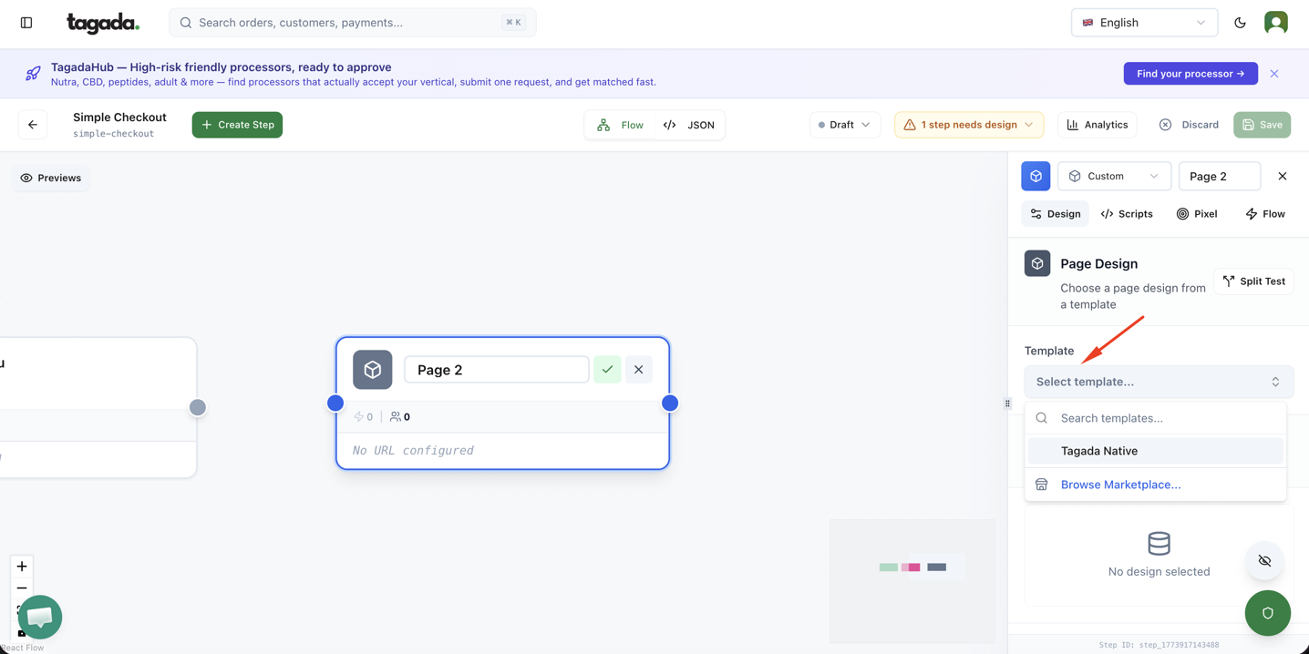 Click on the Custom Page box so that the pop up menu on the right will appear. Click on Select Template to browse the templates marketplace.
