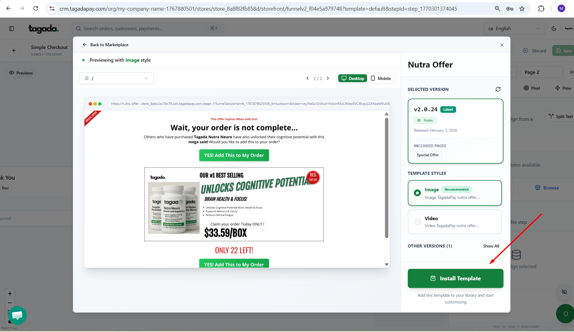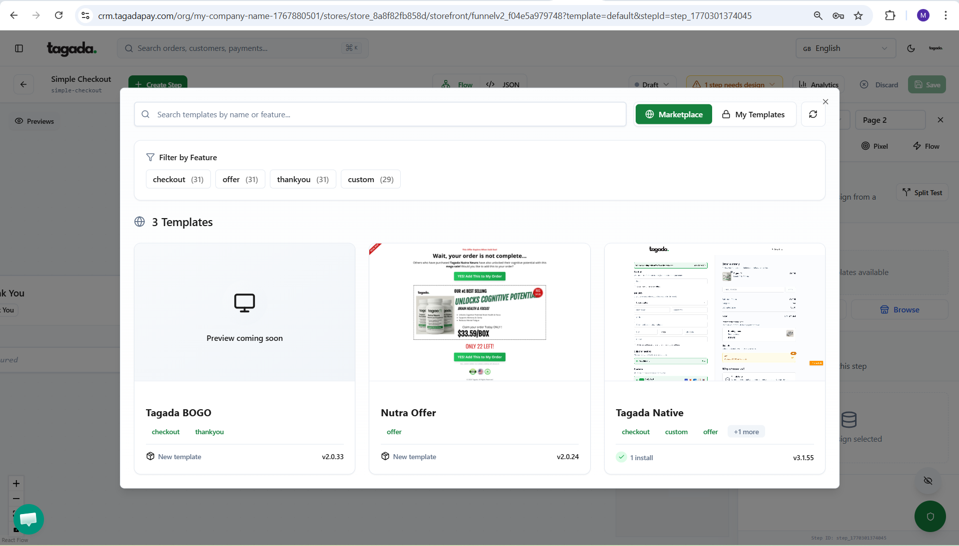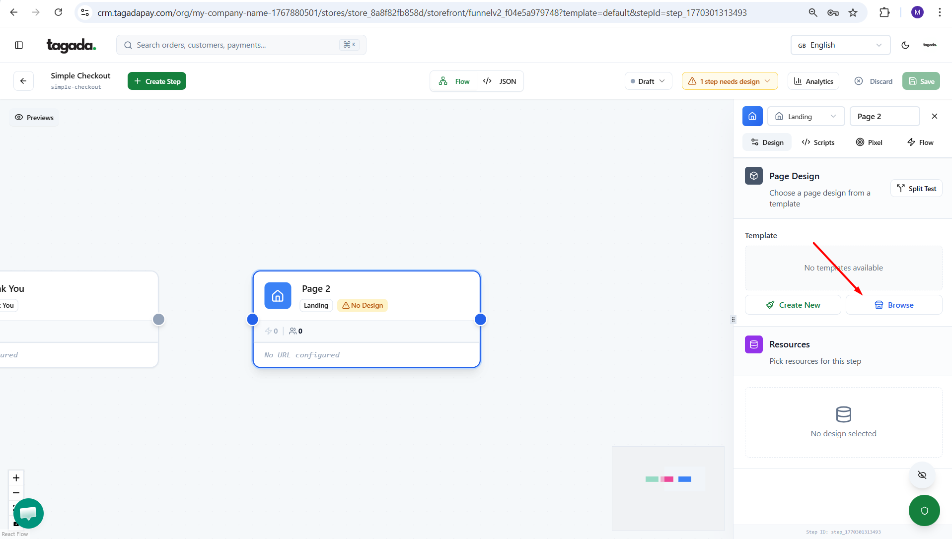 Click on the Landing page box so that the pop up menu on the right will appear. Click on Browse to browse the templates marketplace.