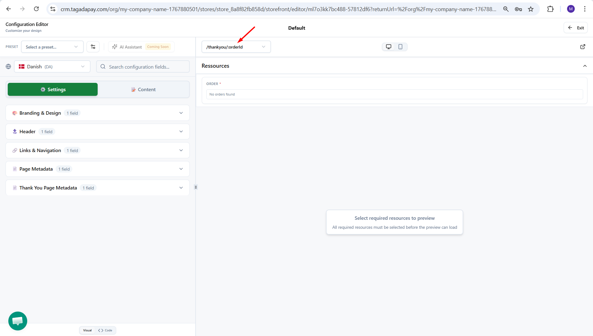 This will open your config editor and from there you will be able to customize the look of your thank you page. Make sure to chose /thank you from the dropdown menu.