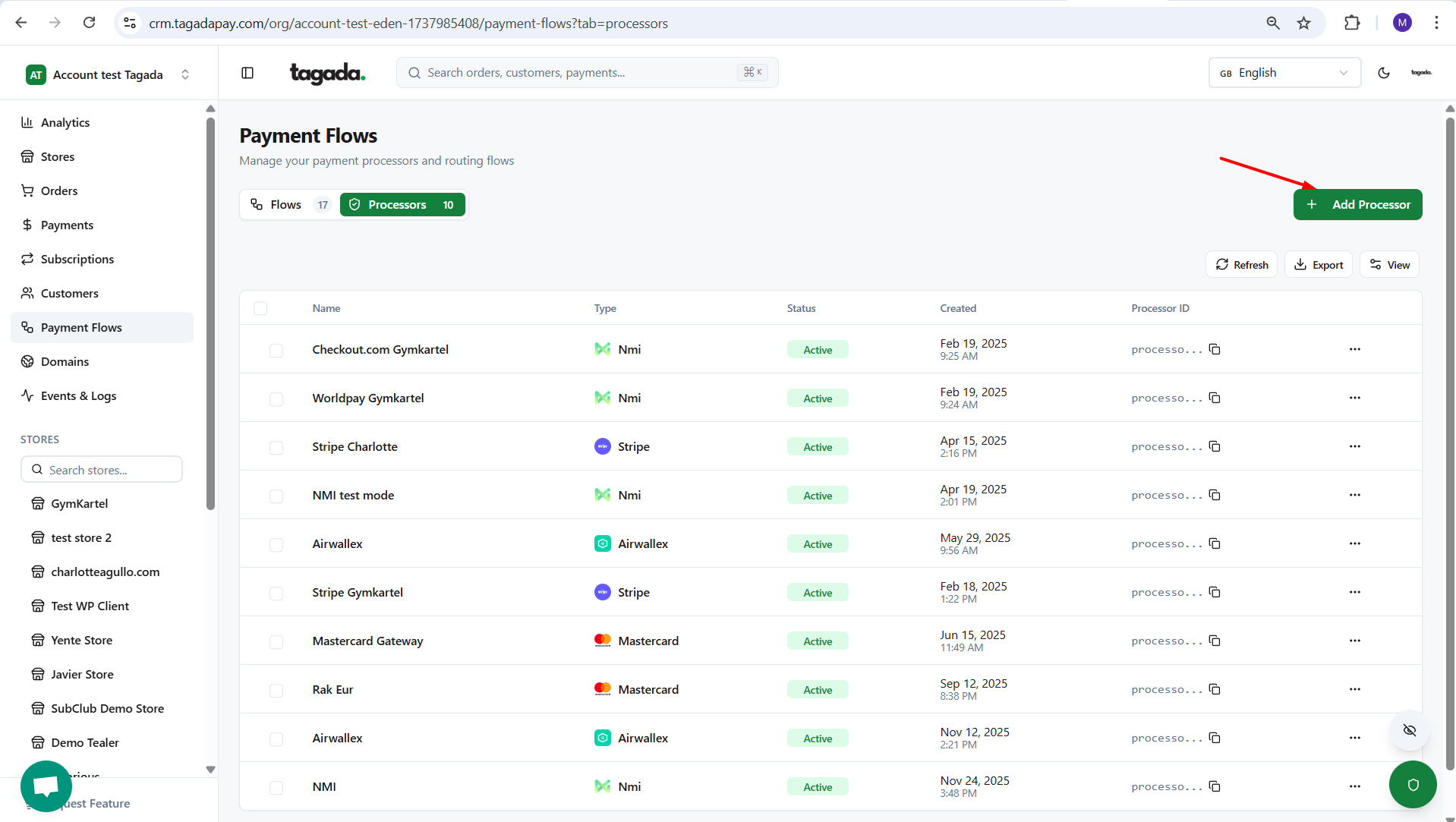 While you're in your Organization, select Payment Flows from the left-hand menu, then click on Processors tab.