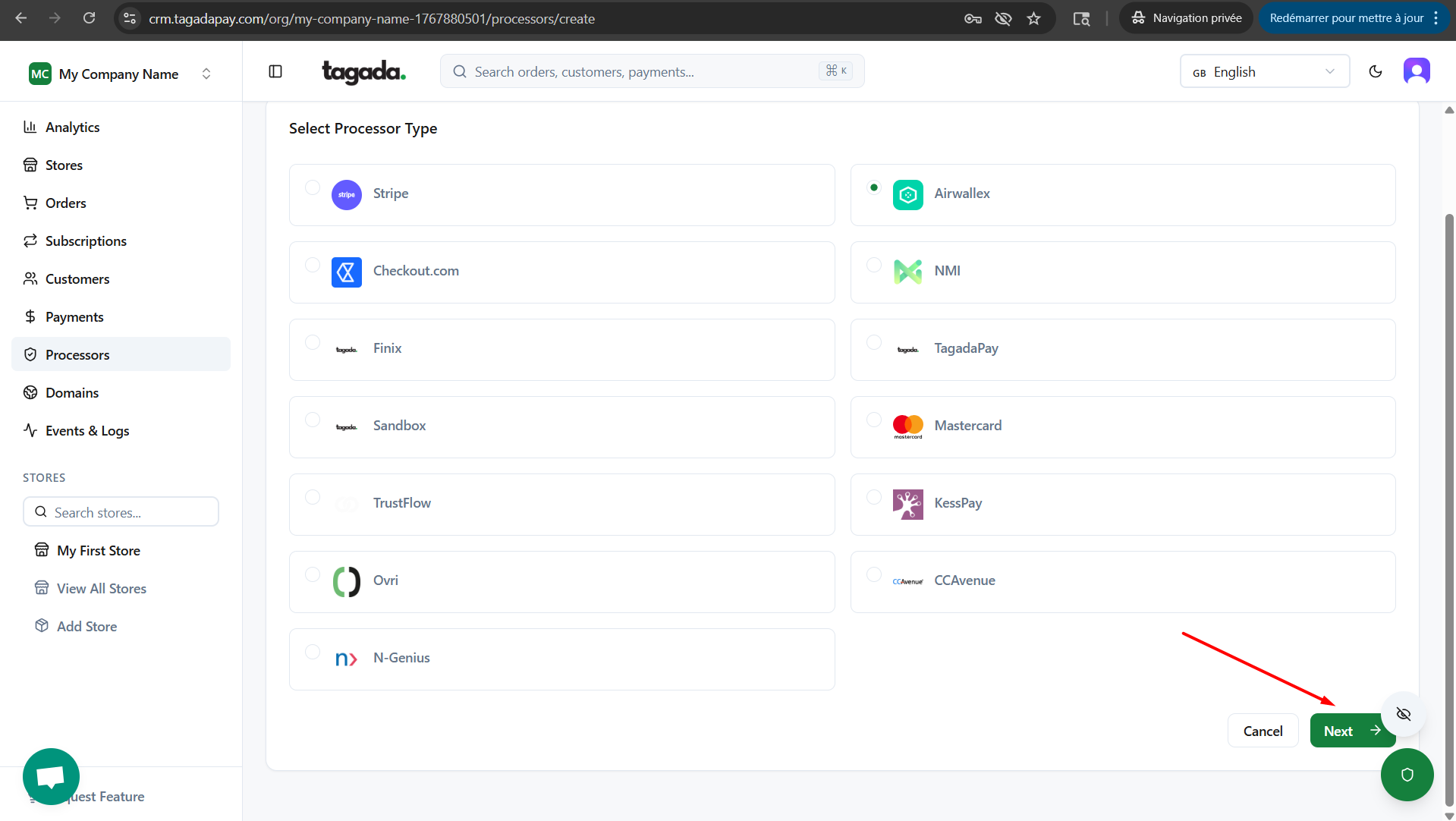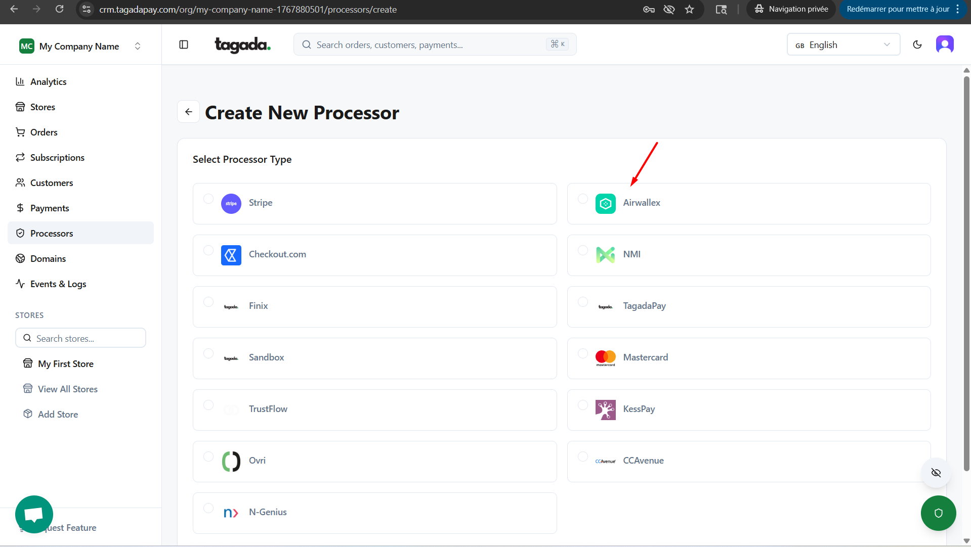 Select the processor you would like to add. If your processor is not available, please get in contact with your Account Manager.