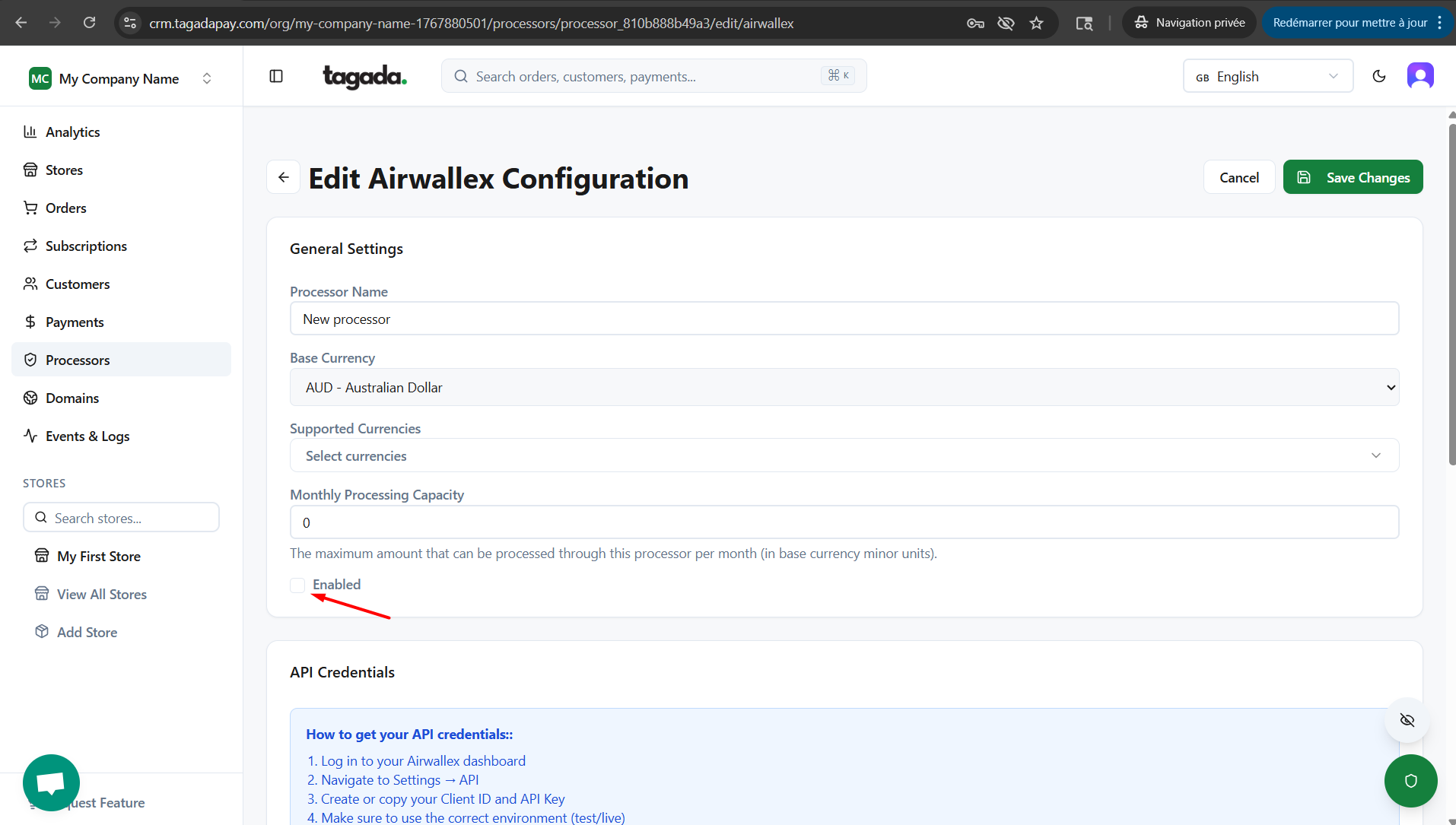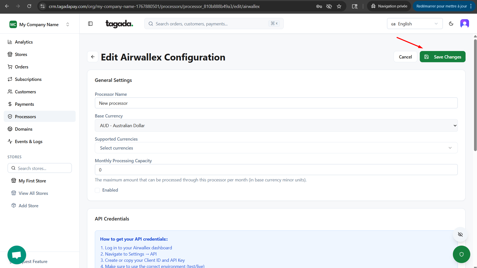 Enter all the information required for your processor and click on Save Changes.