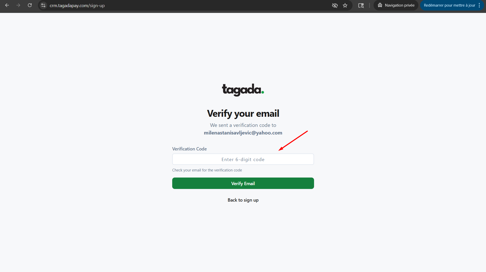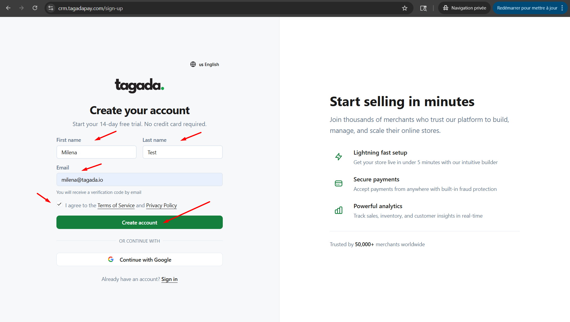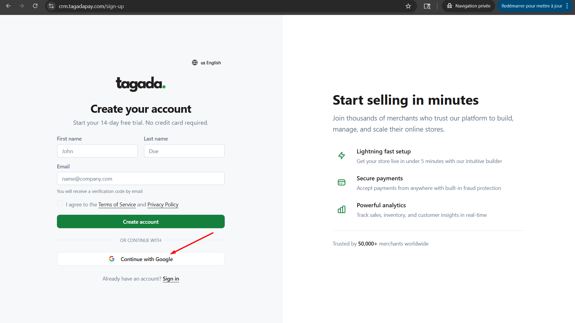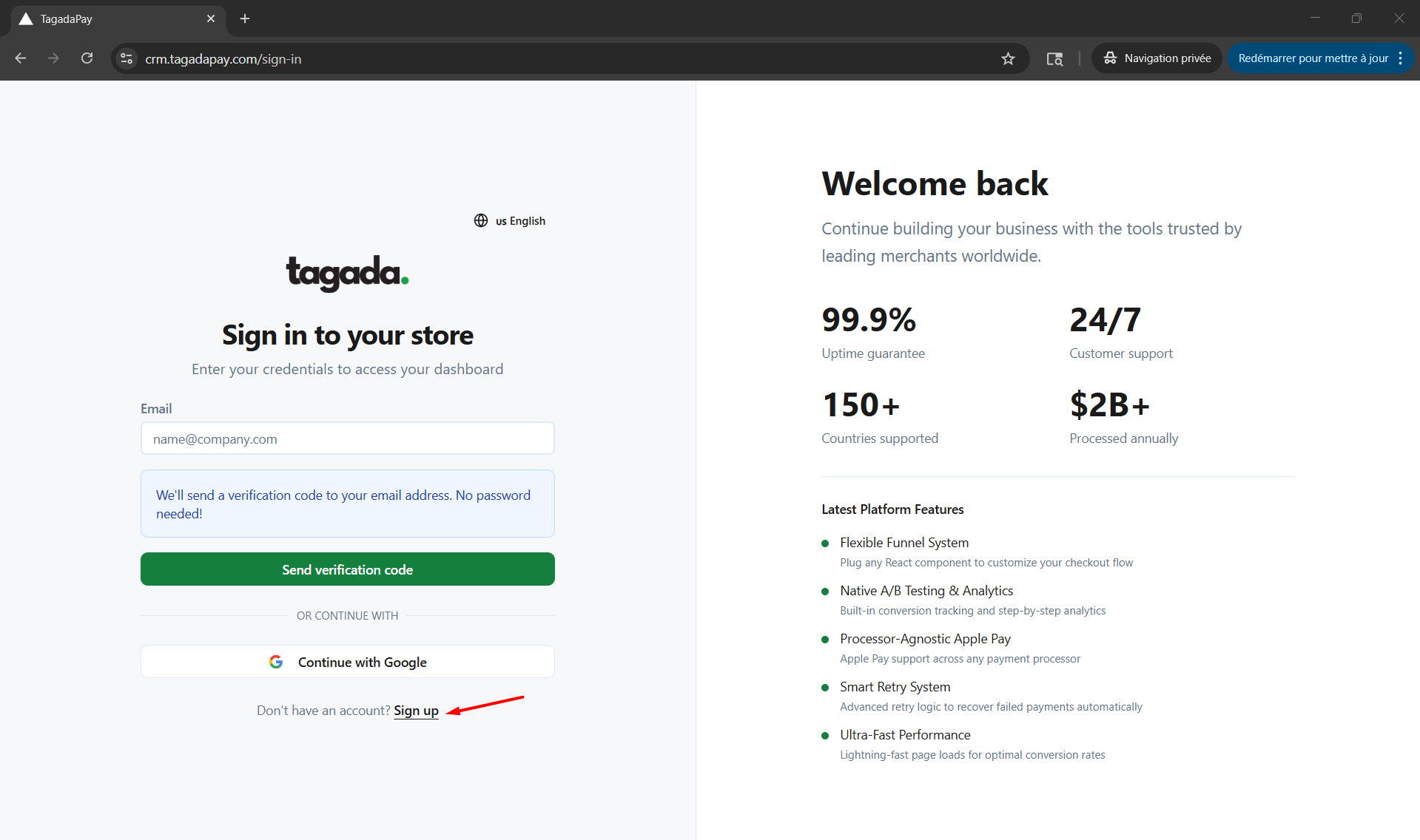 The first step in connecting Tagada is to create an account on the Tagada website. Click on the Sign up button.