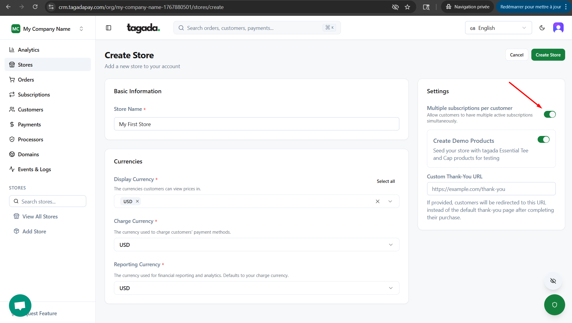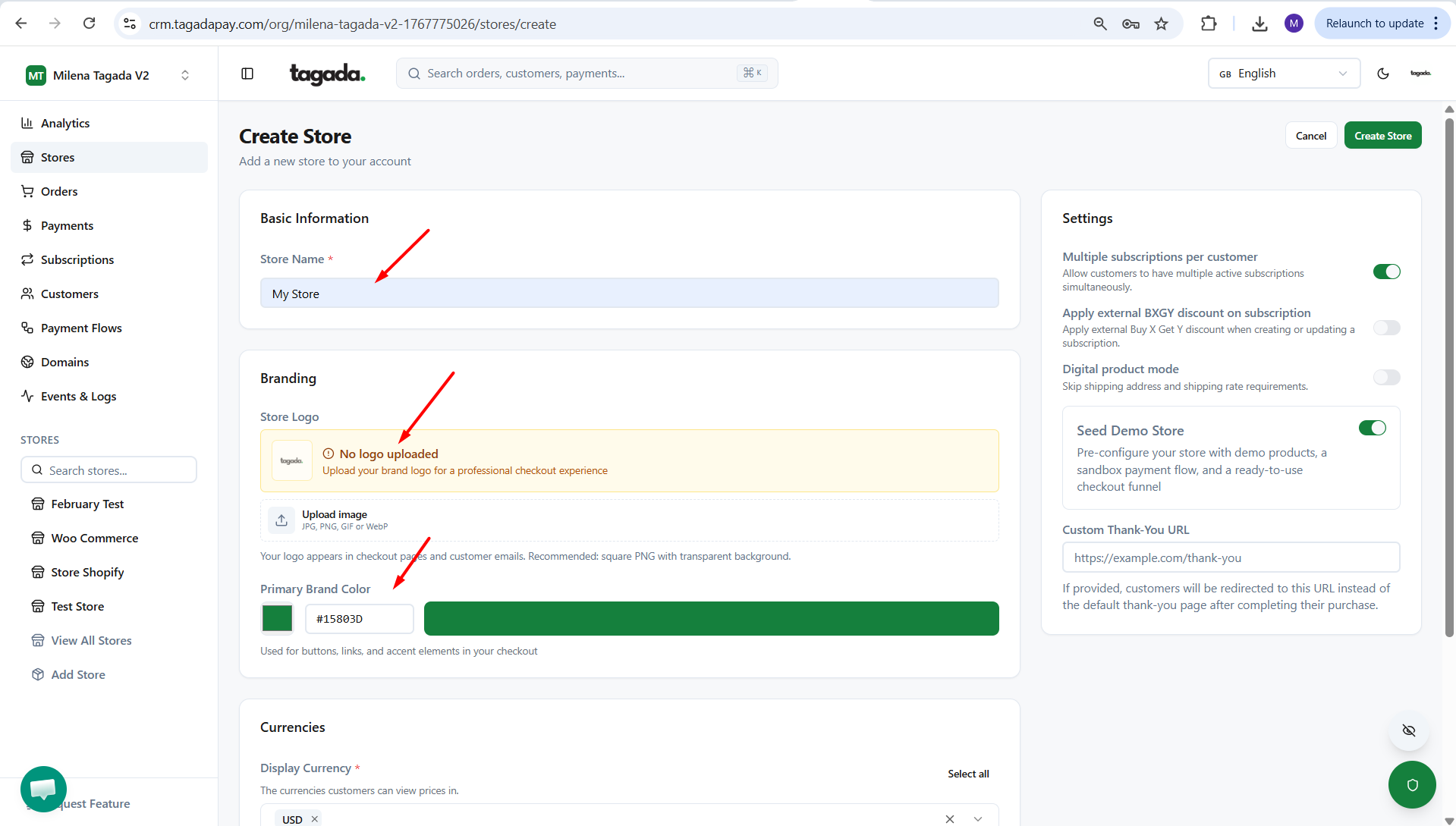 If you want to create demo products for your store for testing purposes make sure to enable that option at this step. This will add two Tagada products to your store.