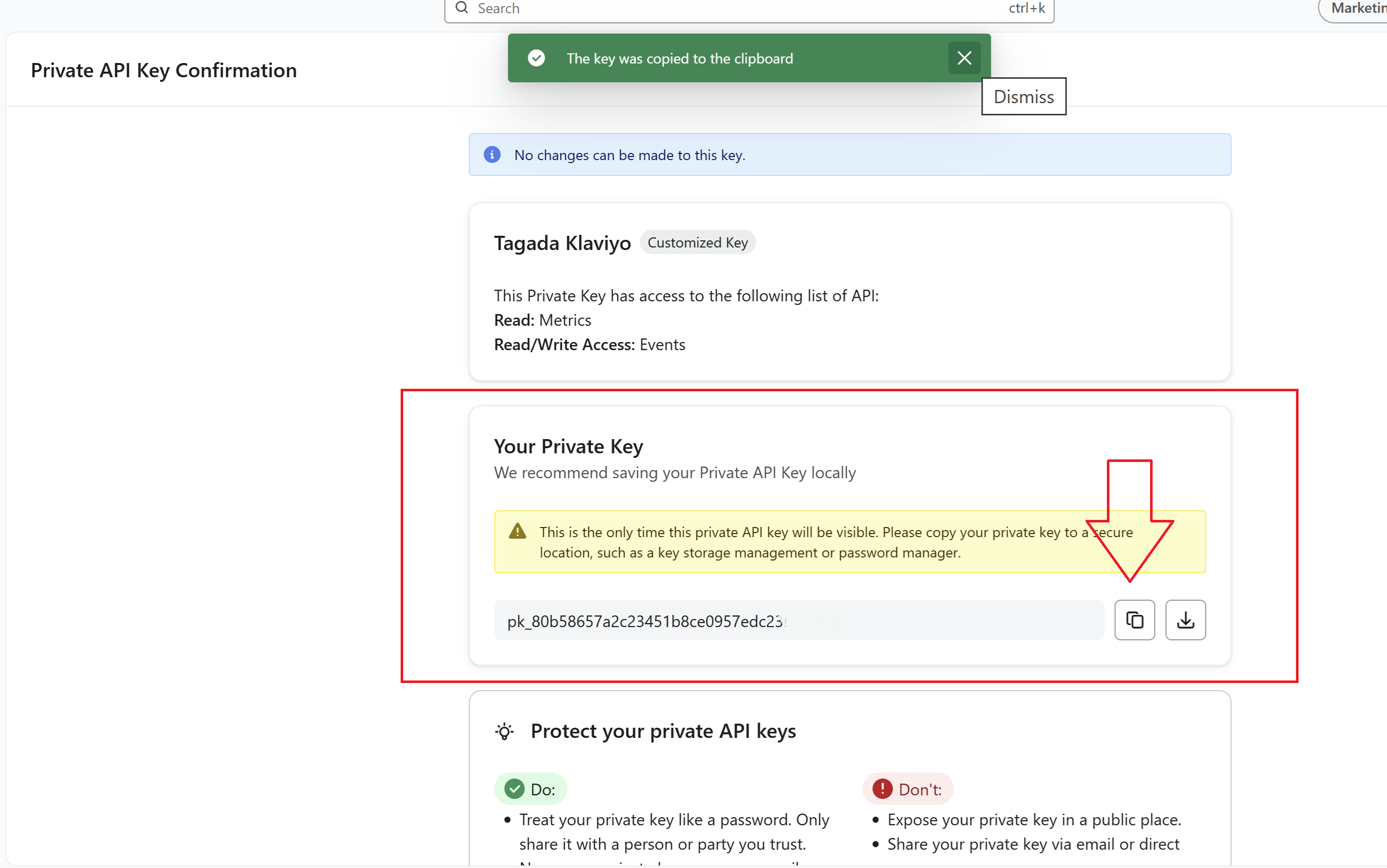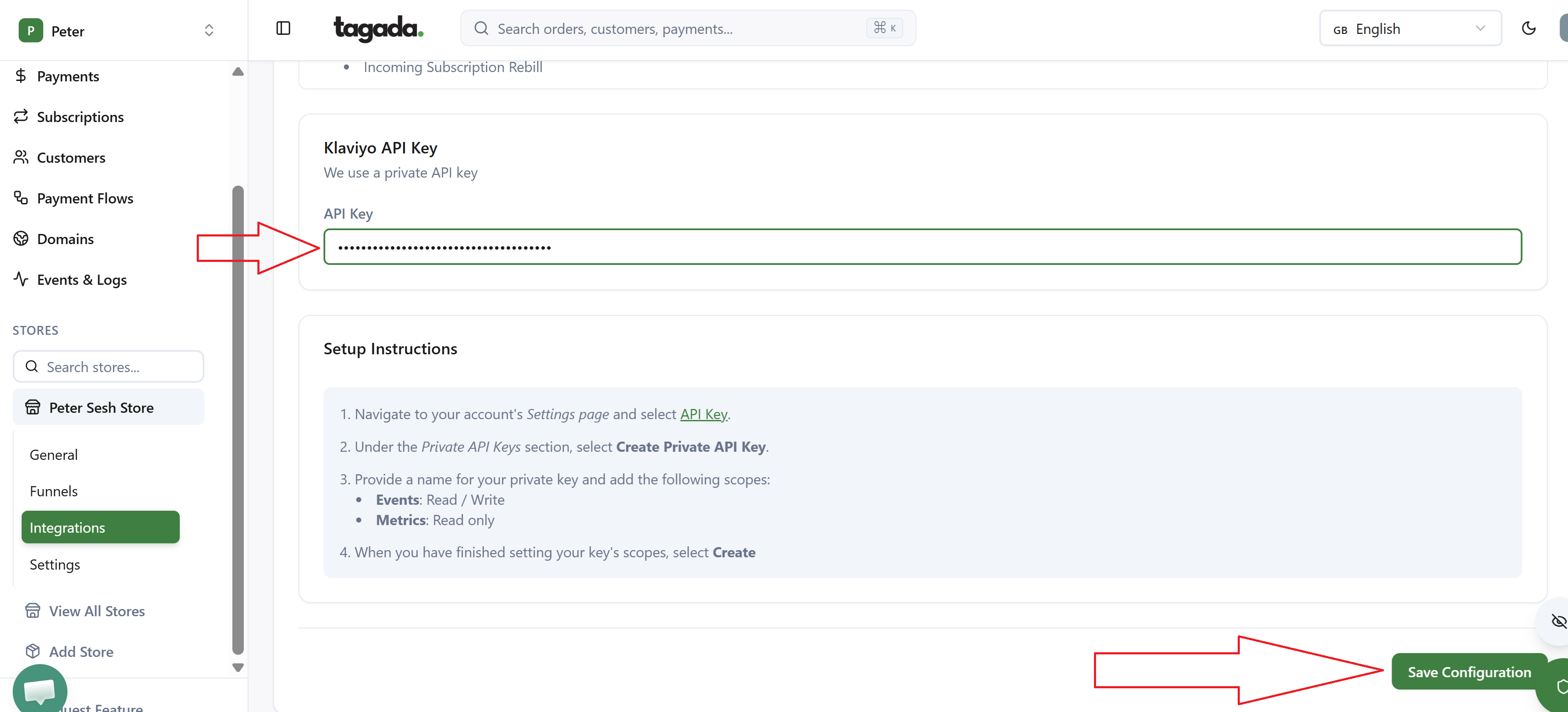 In Integrations - Klaviyo - API key, you paste your private key and press Save Configuration