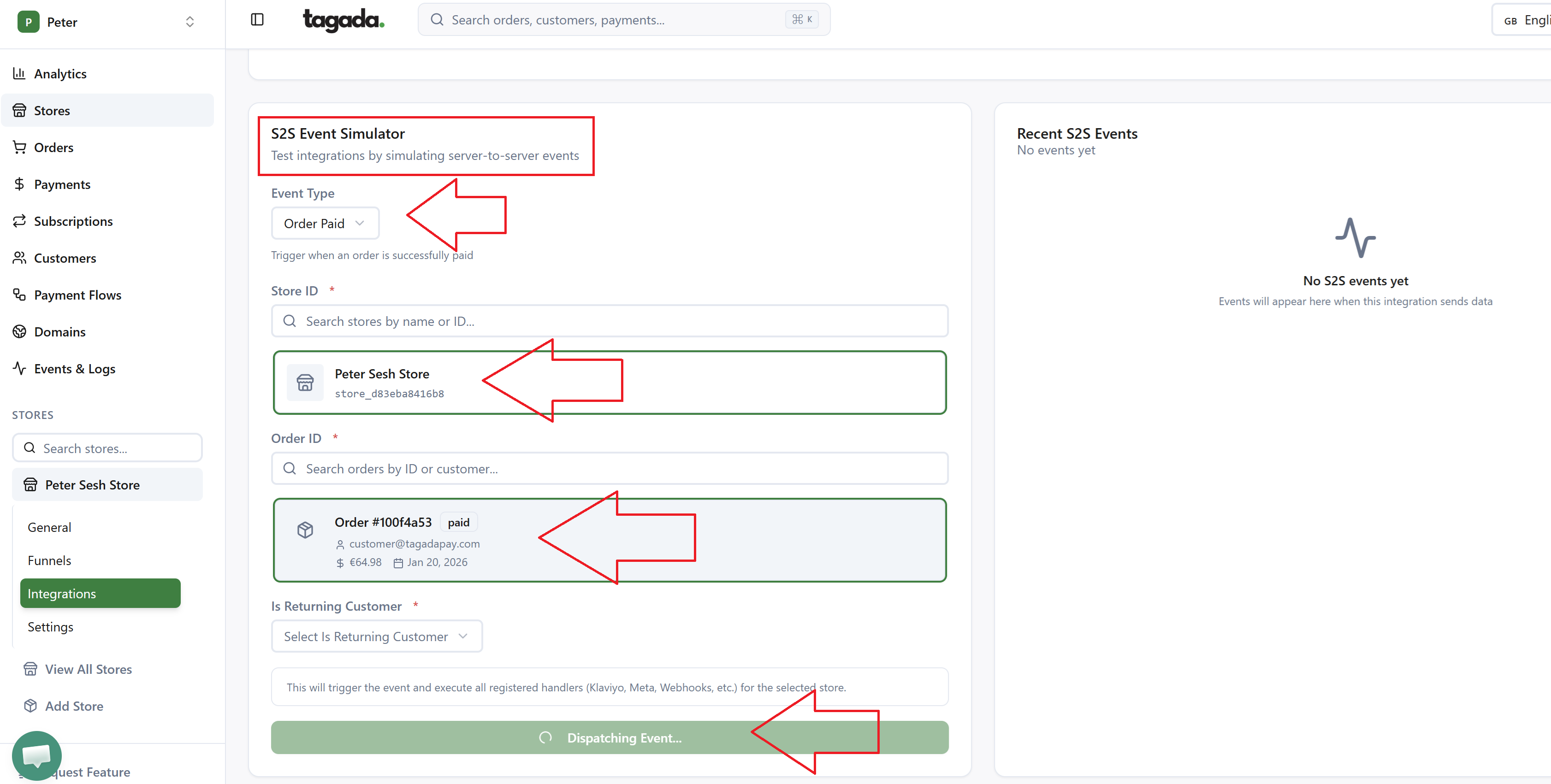 Then you have to test the connection. If you scroll to the bottom you will see the test event simulator. You select your event type, then your store and the example order that you have and press Dispatch event to send the test event and officially connect it.