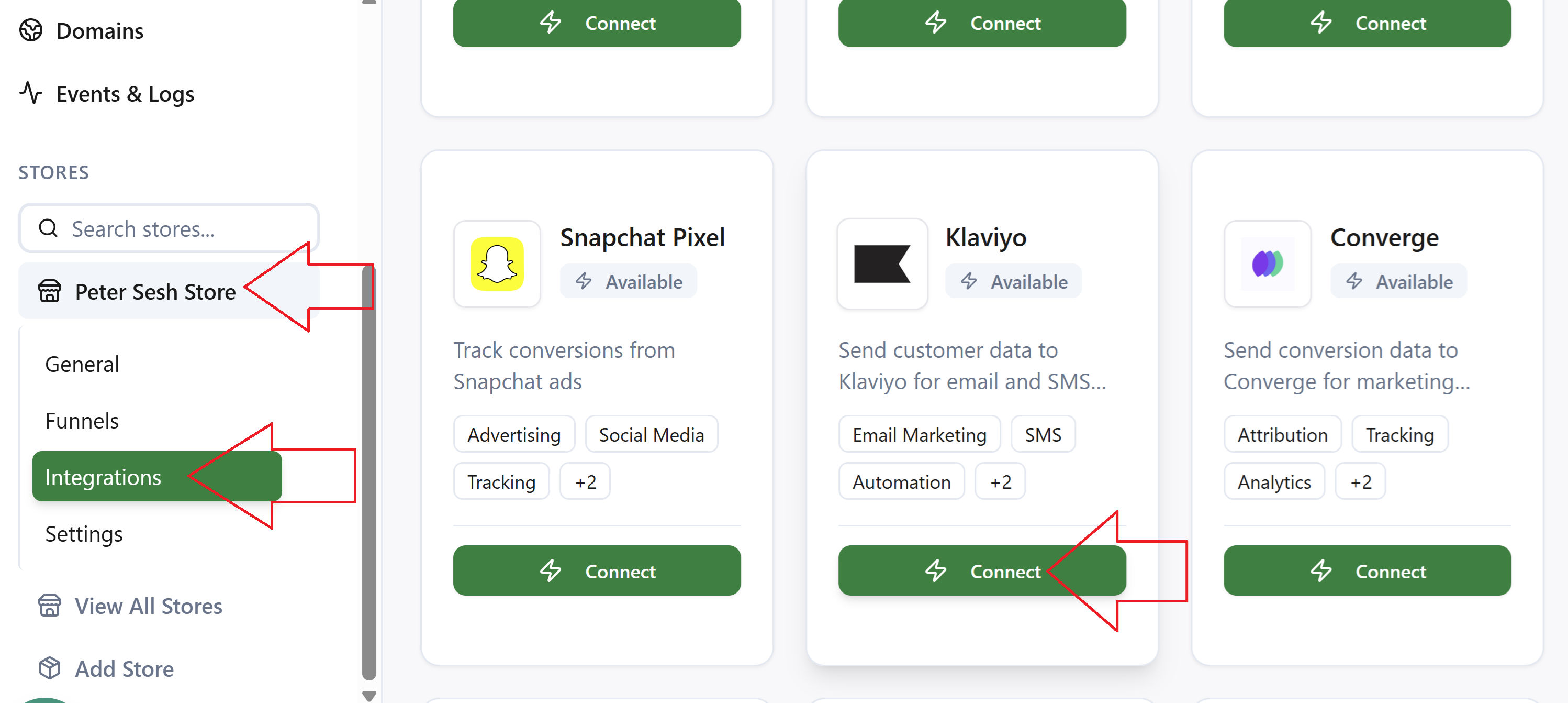 Then you go to the Tagada Platform, click on your store and go to integrations, find Klaviyo and click on Connect