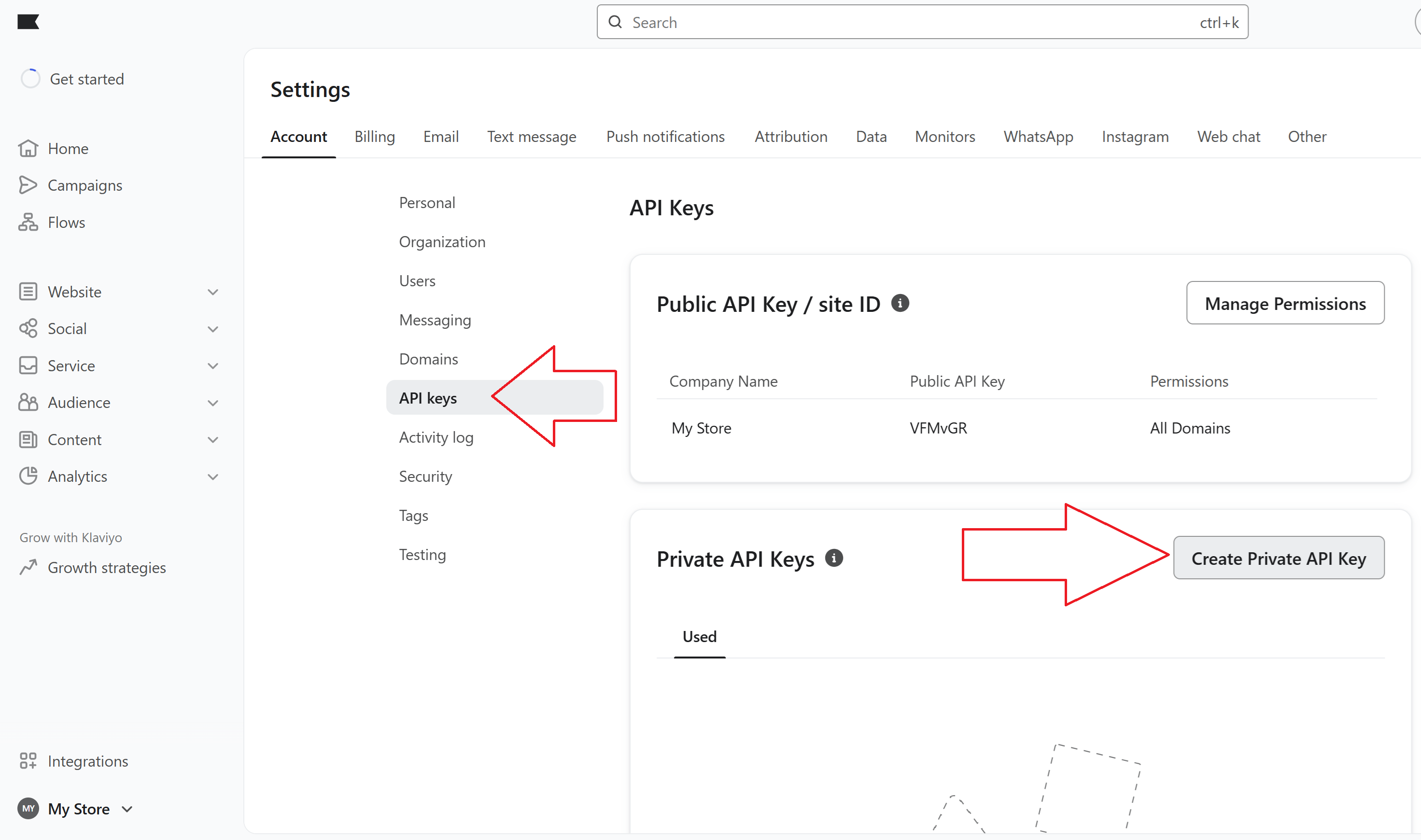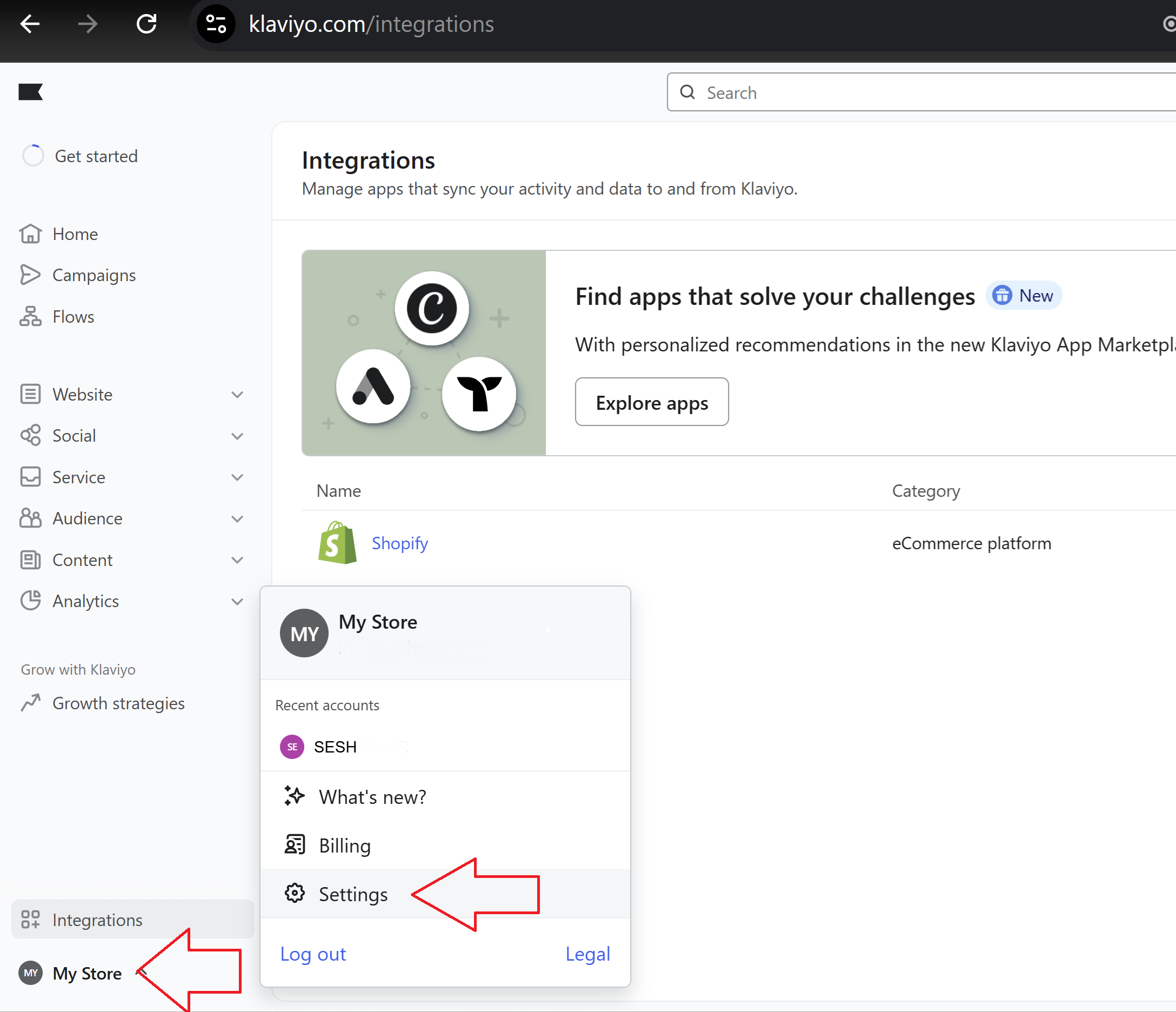 Then you have to find your API keys. Go back to your Klaviyo account, click on your store, then settings