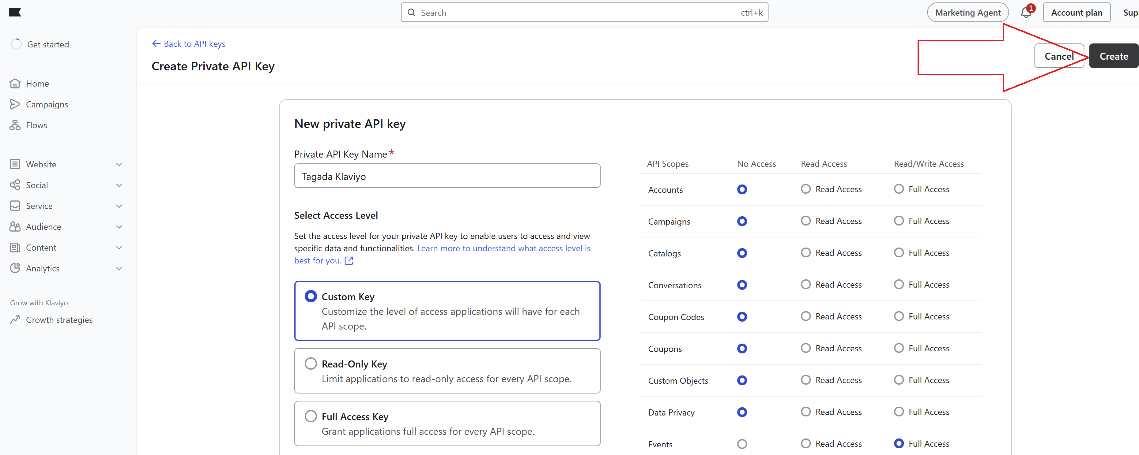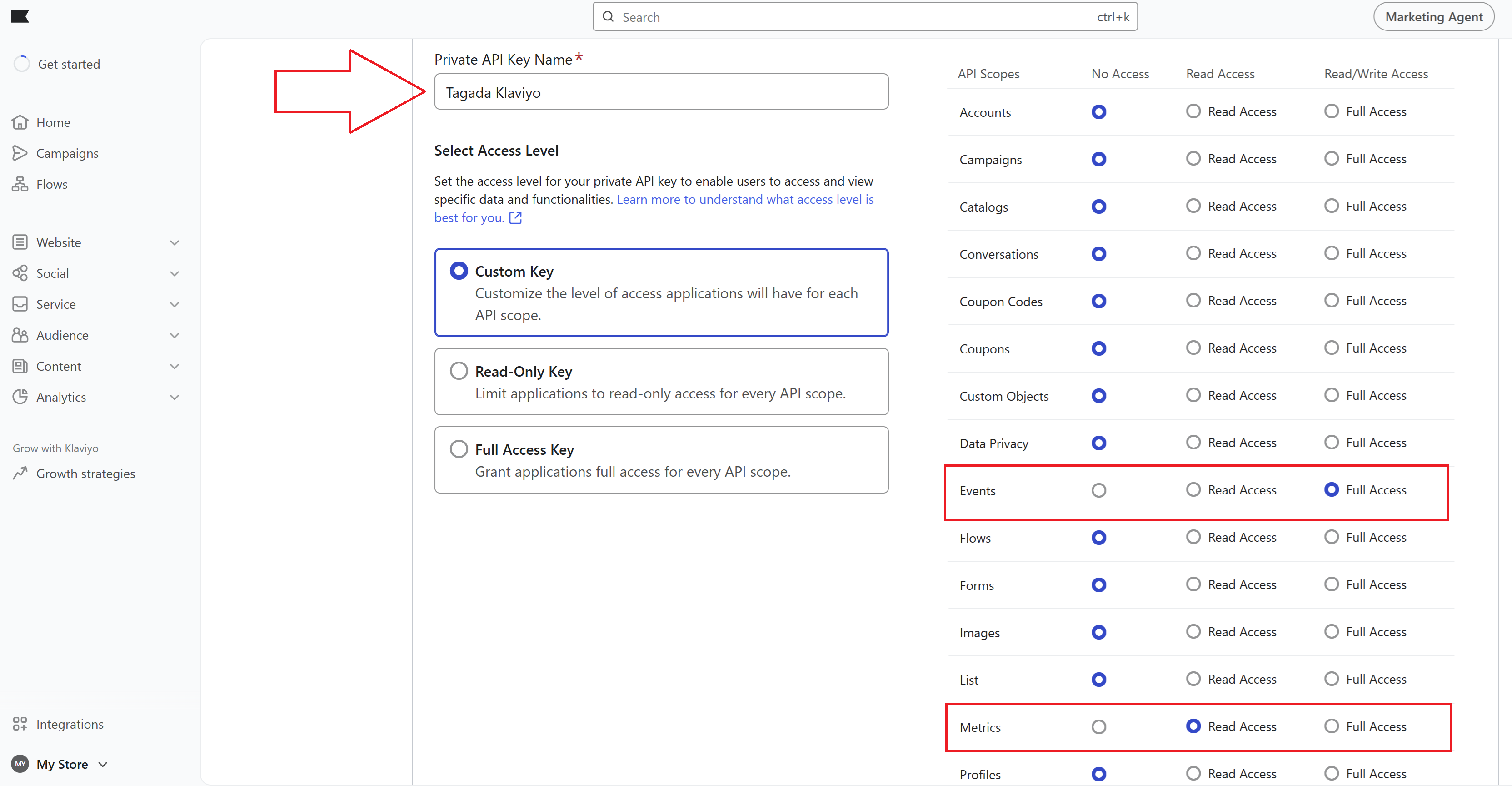 Name your private key as you wish, for example Tagada Klaviyo. Then you select Custom Key. Then on the right hand side you will see all the permissions. You have to select only two: