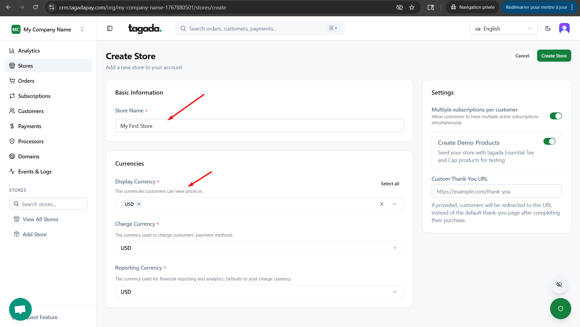 Enter the name of your store (only visible on your Tagada account, this will not affect your store on Shopify), then chose your Display Currency, Charge Currency and Reporting Currency.