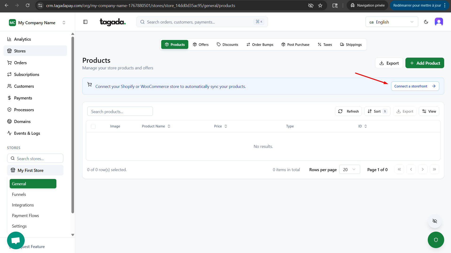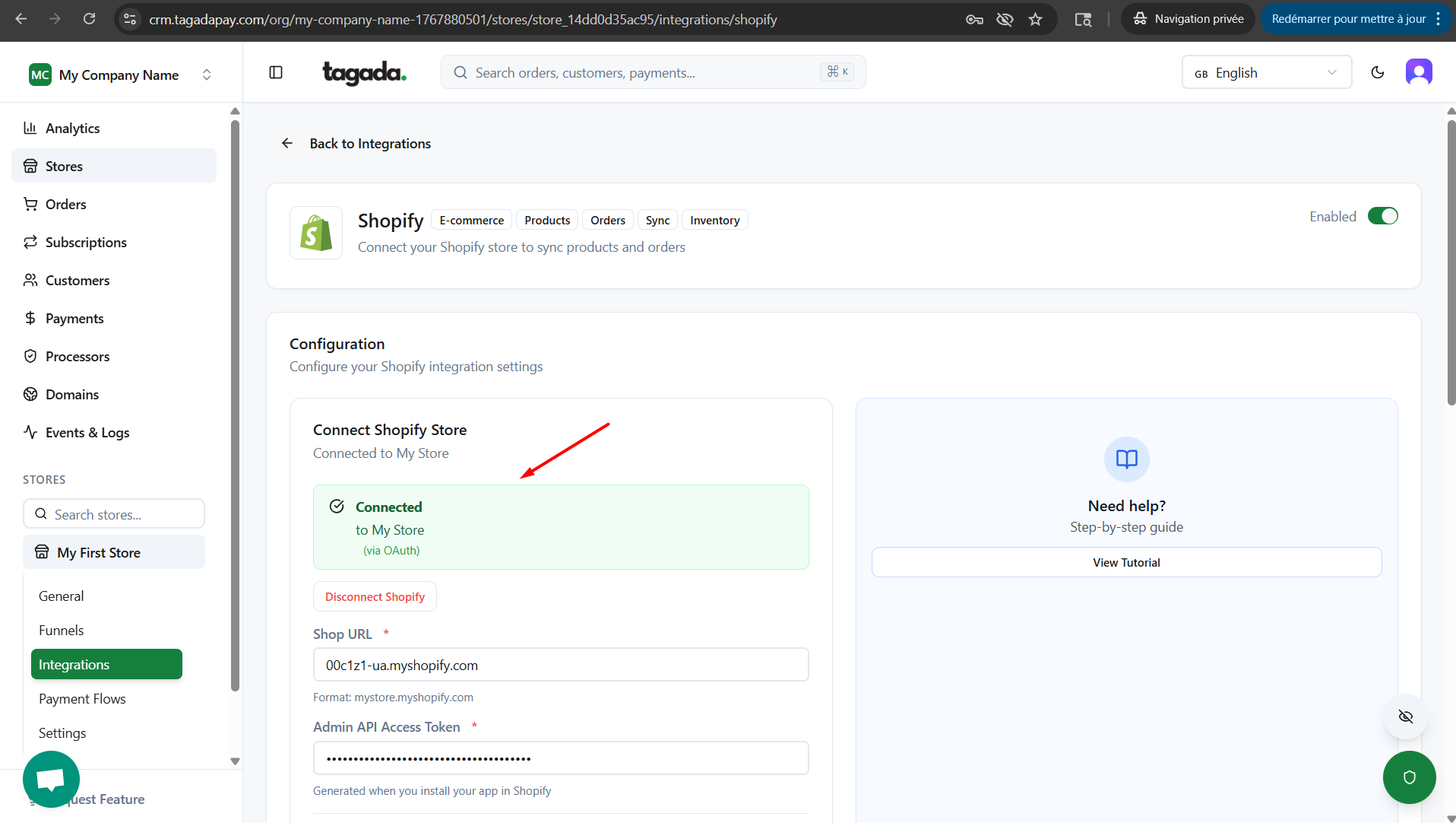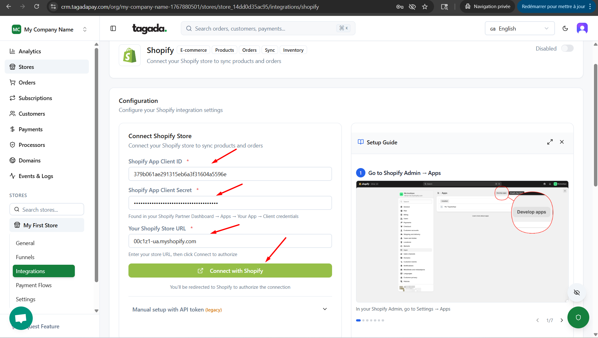 Paste it on Tagada. Enter your Shopify Store URL by strictly respecting the format mystore.myshopify.com. Click on Connect to Shopify.