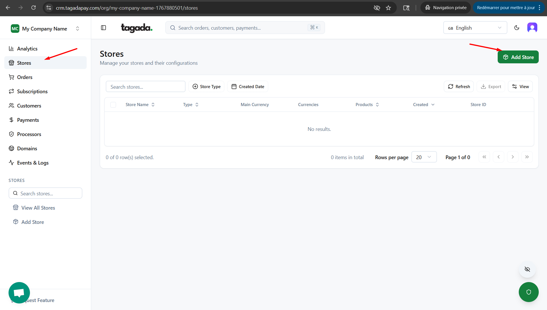 In your Tagada account click on Stores on the left side menu and then click on the Add Store button.