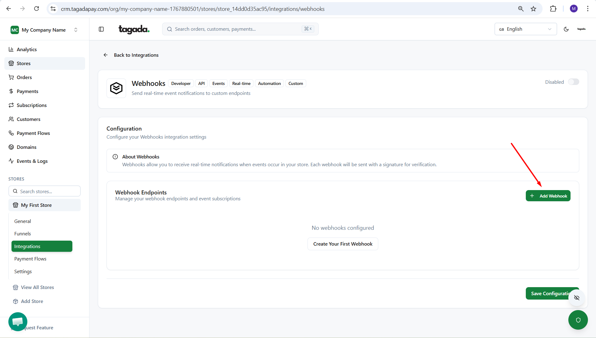 Go to Integrations on the left side menu. Find Webhooks and click on Connect.