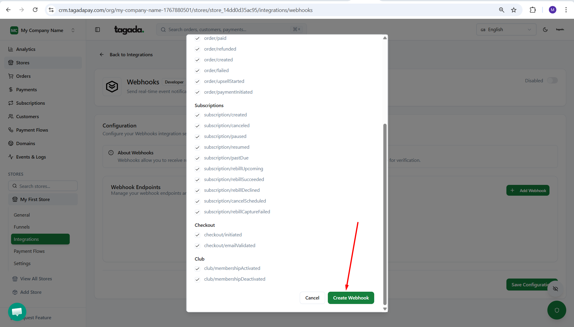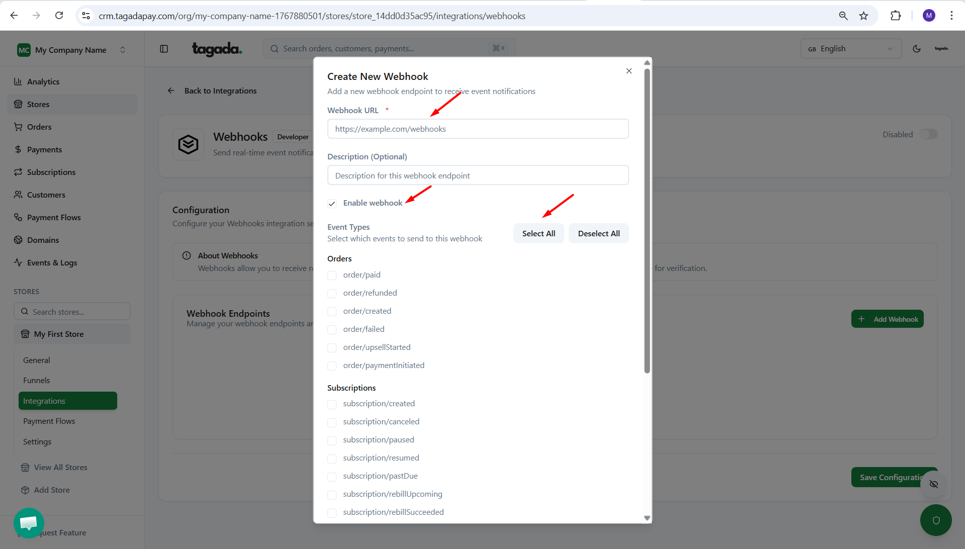 Enter the information needed, make sure to check the Enable webhook option and Select All events.