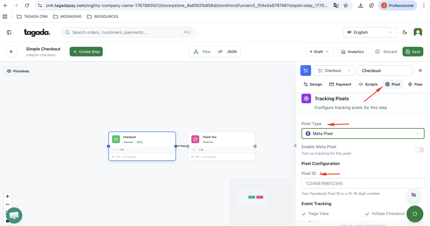 Keep in mind that only one pixel type can be activated per funnel. Available options include Meta Pixel, TikTok Pixel, Snapchat Pixel, Pinterest Pixel, and Google Tag Manager. Refer to your chosen pixel platform’s documentation for instructions on obtaining your Pixel ID.