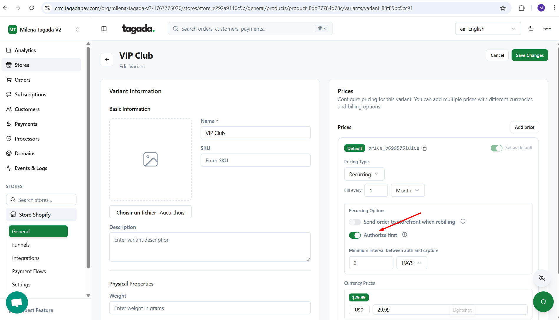 Enabling the Authorize First option is particularly interesting when processing subscription payments. This means the system will authorize the funds for a specific number of days before actually charging the customer. After this period, the transaction is captured and completed.