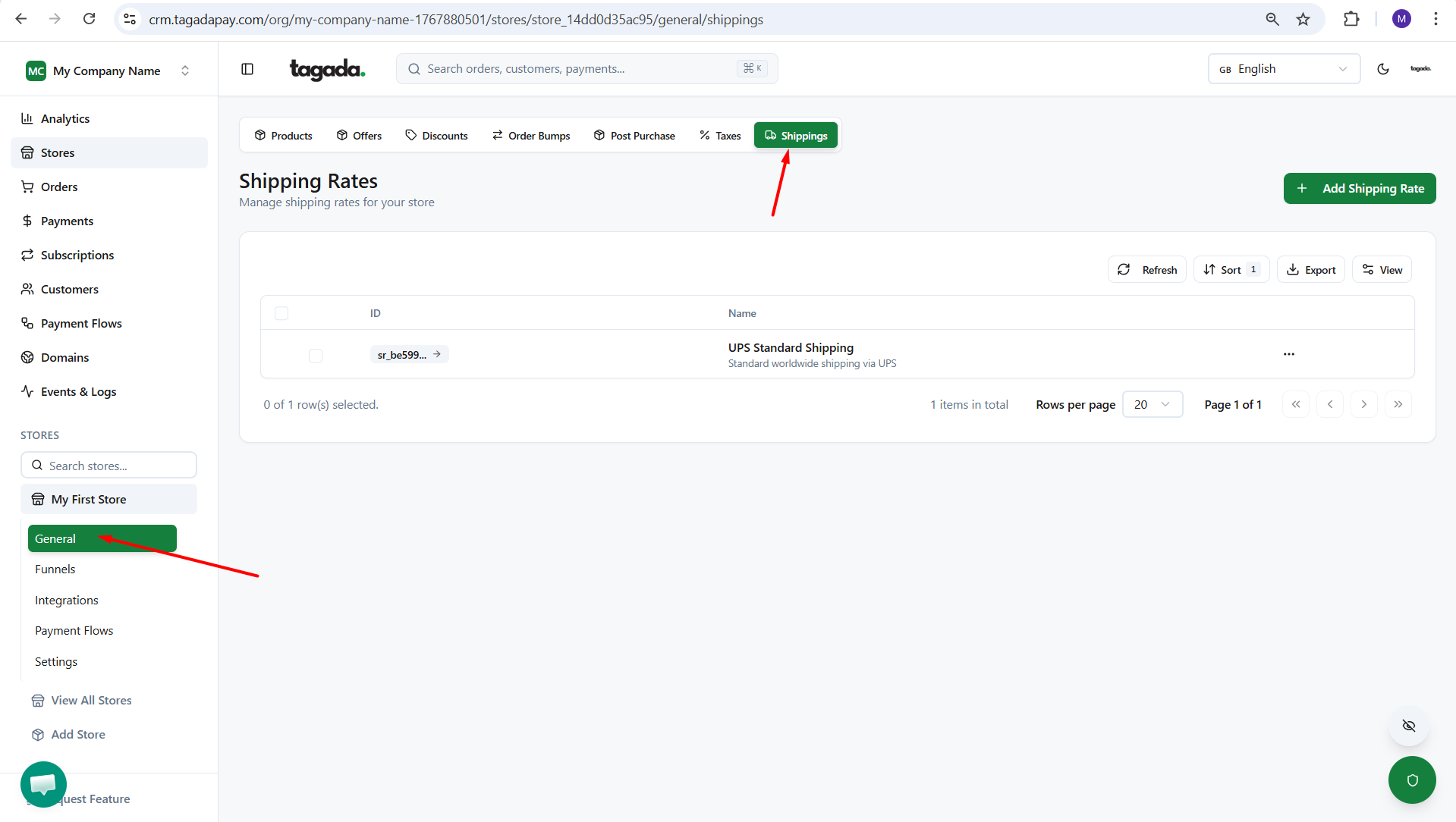 Click on General and then click on Shippings