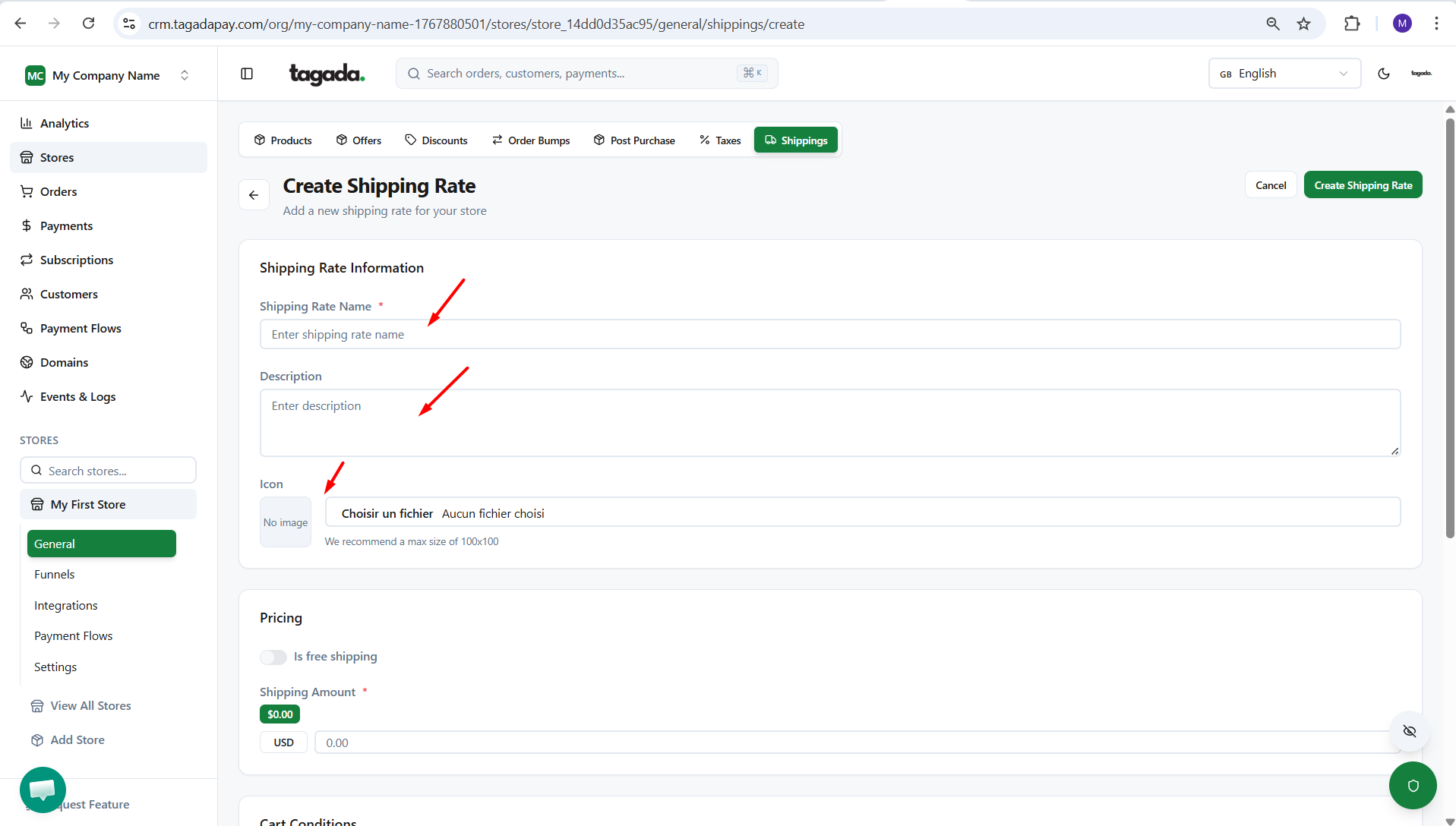 Set your shipping rate. If shipping is free, check the ‘Free Shipping’ option. If it’s paid, enter the Shipping Amount. You can also define conditions based on minimum and maximum order value.