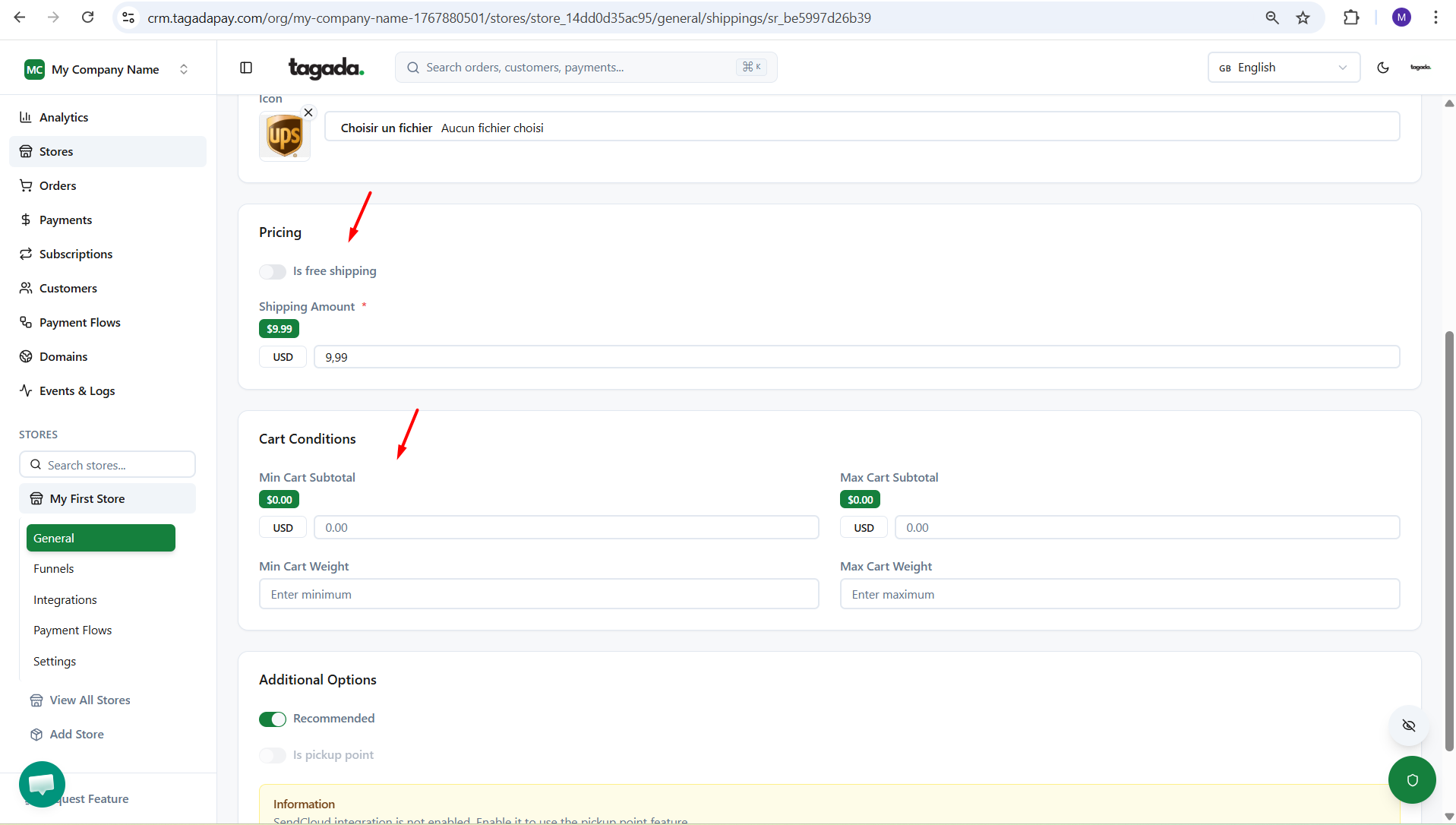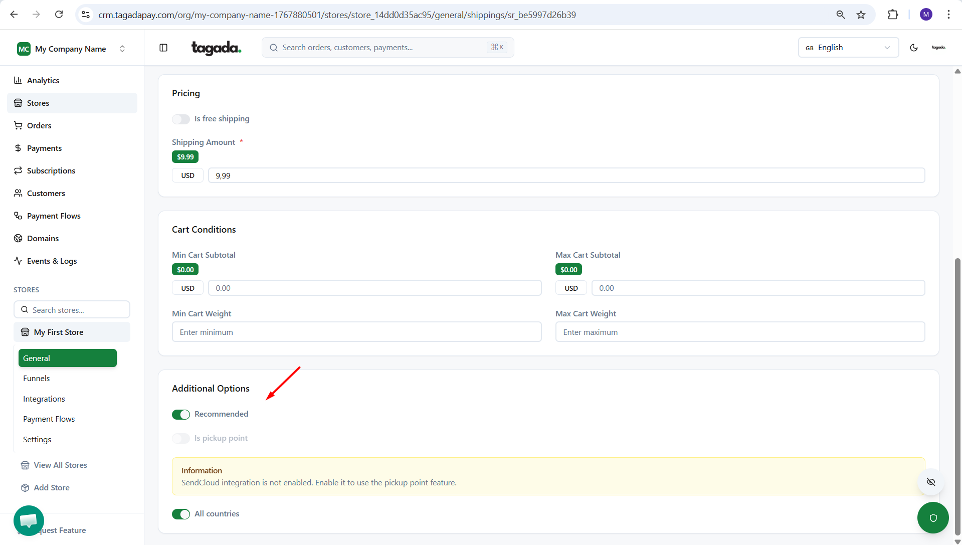 Under Additional Options, you can mark it as Recommended, which means it will appear at the top of the shipping rates list at checkout. You can also set it as a pickup point and limit the countries where it applies.