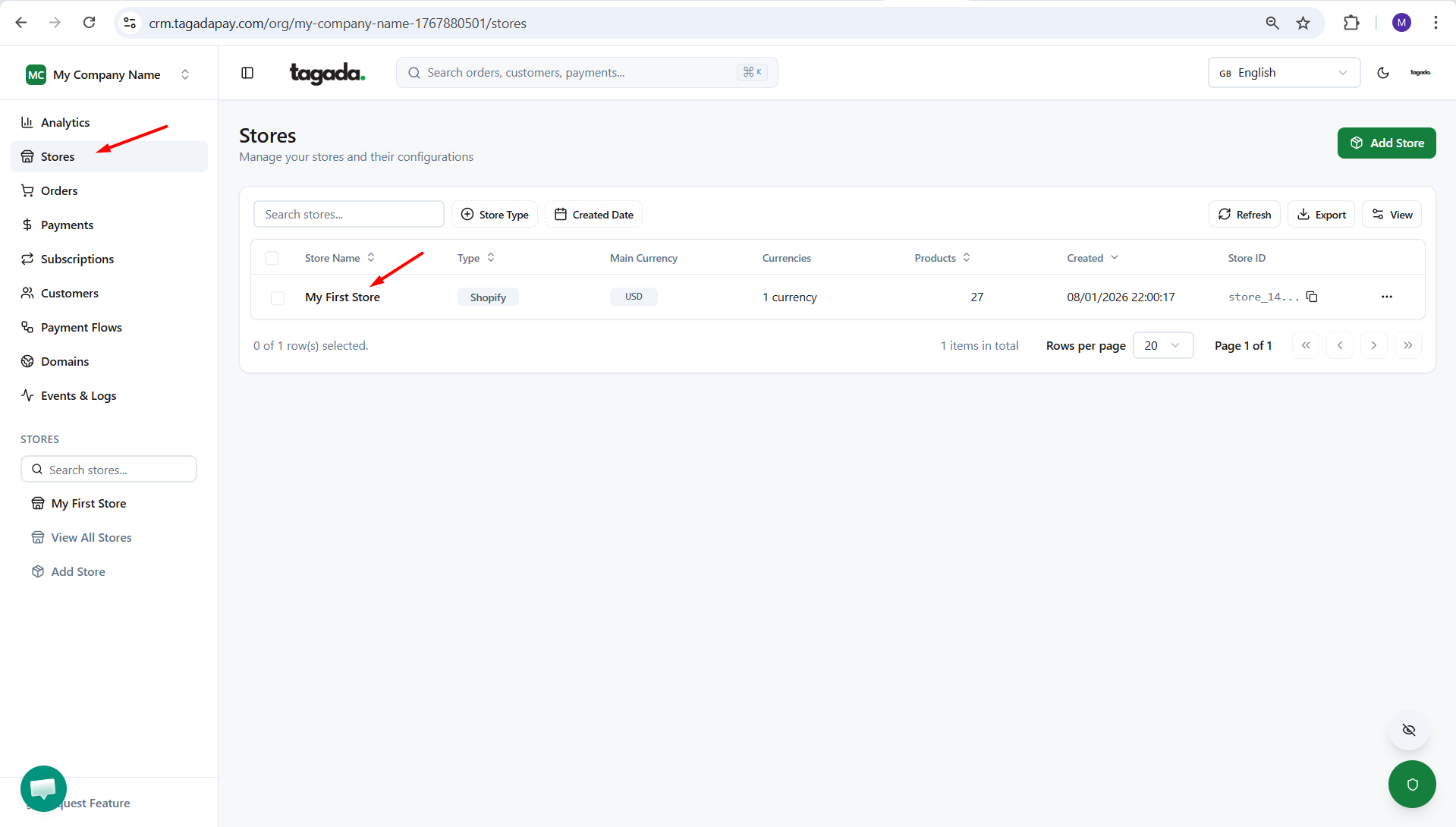 In your Tagada account click on Stores, then chose your store.