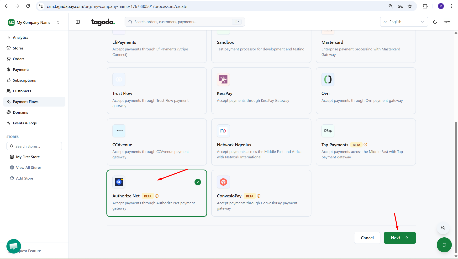 Select Authorize.Net. Click on Next.