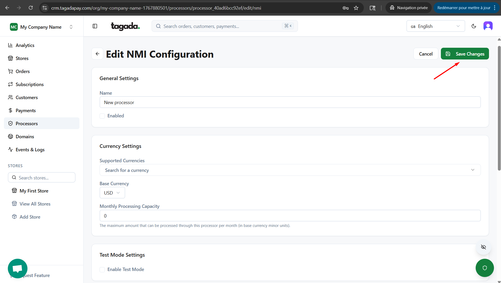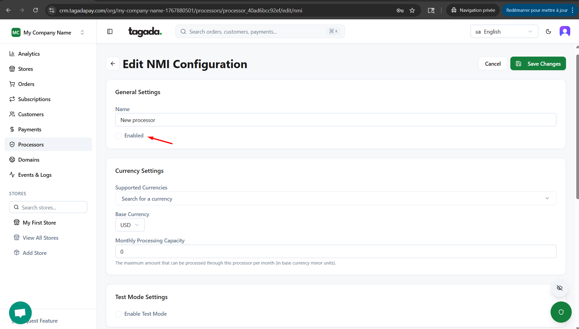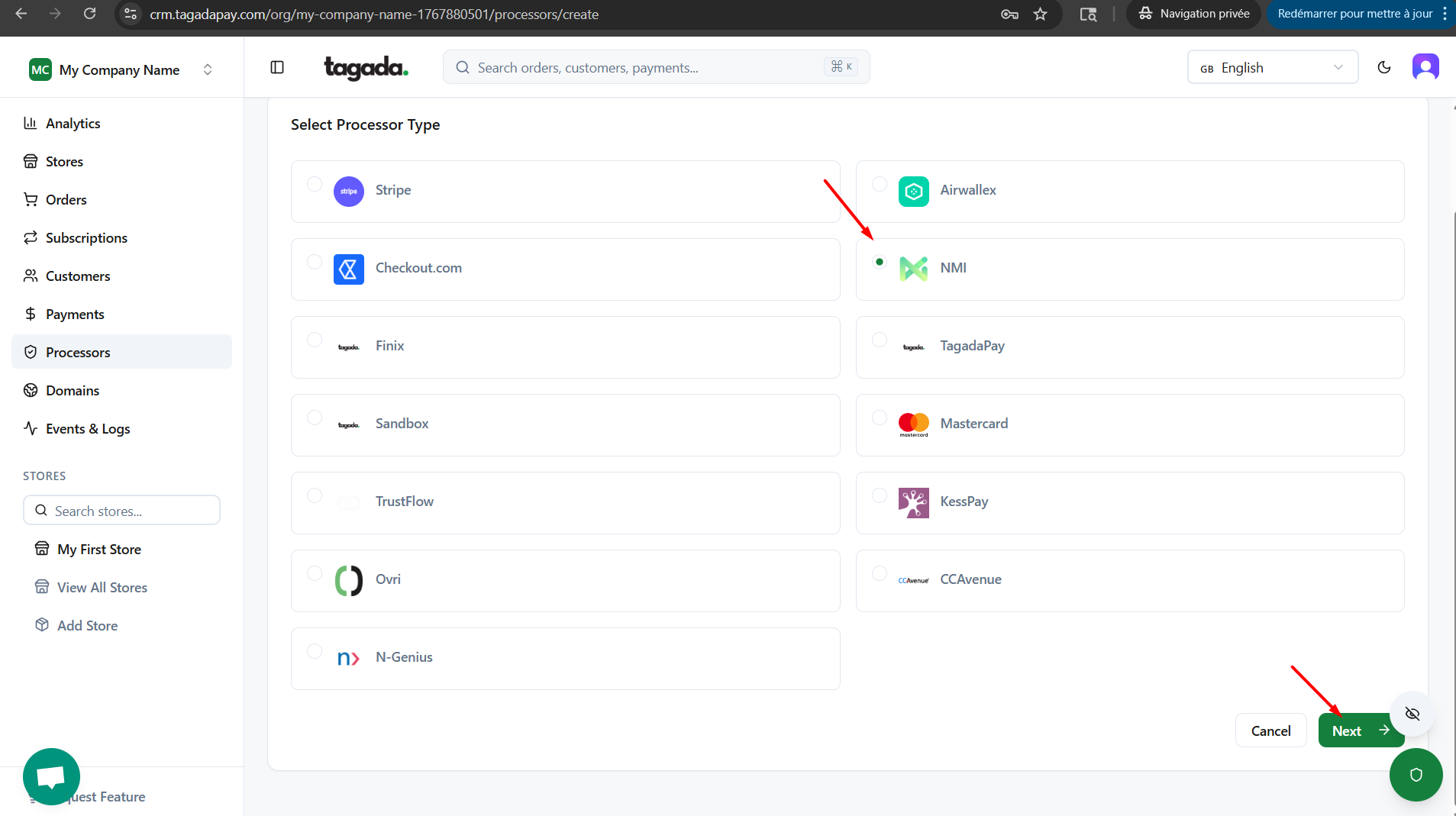 While you're in your Organization, select Payment Flows from the left-hand menu, then select the Processors tab and click on Add Processor.