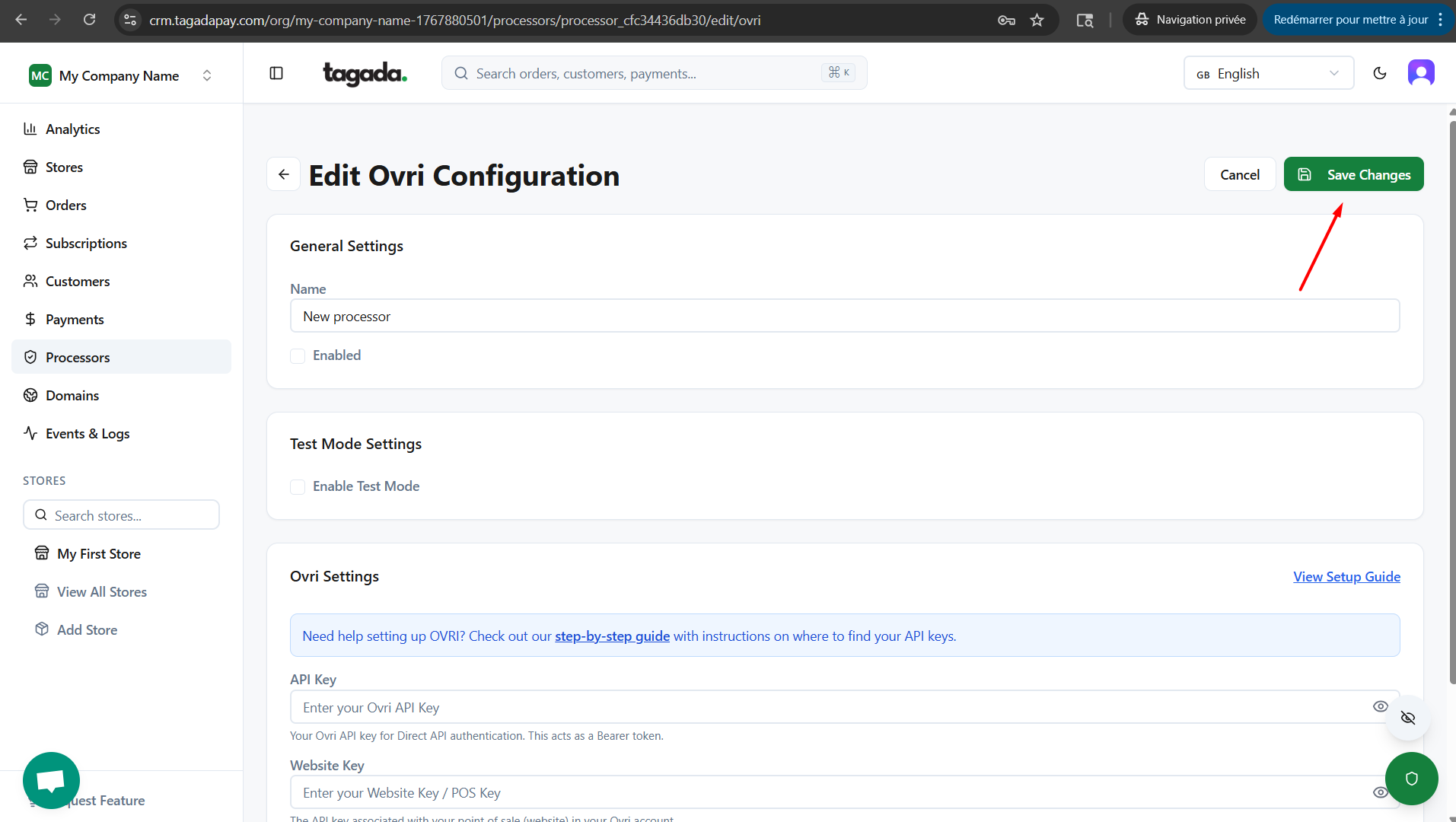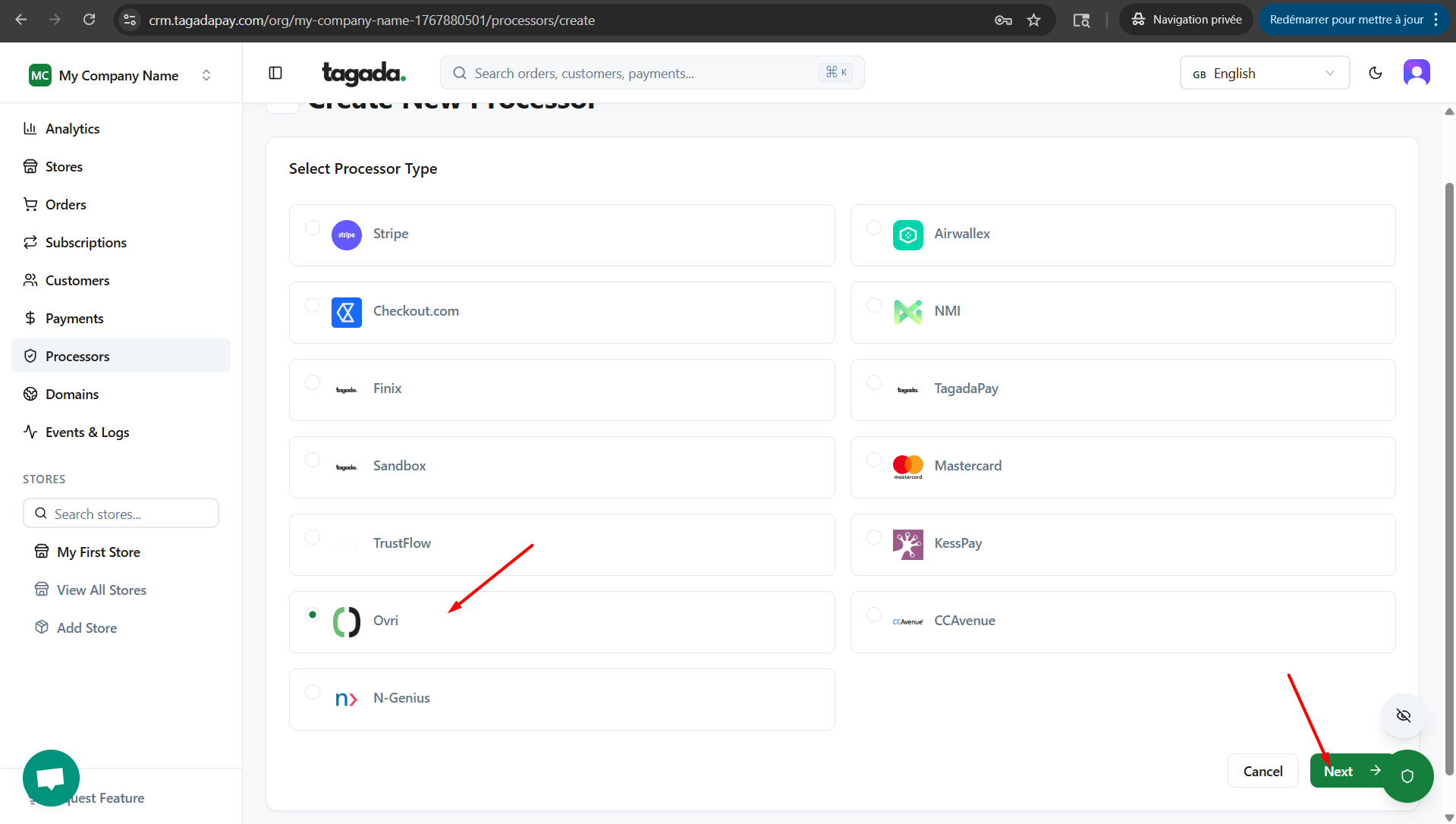While you're in your Organization, select Payment Flows from the left-hand menu, then select the Processors tab and click on Add Processor.