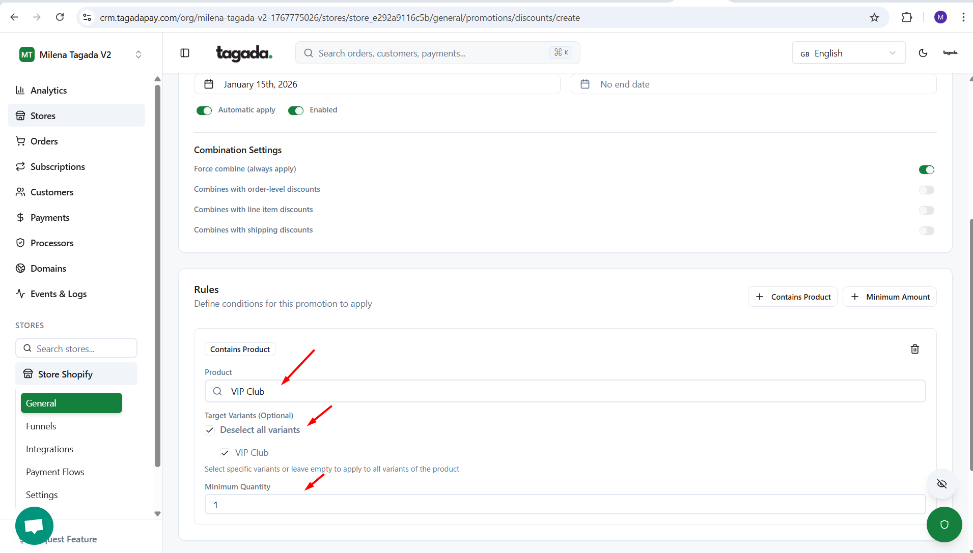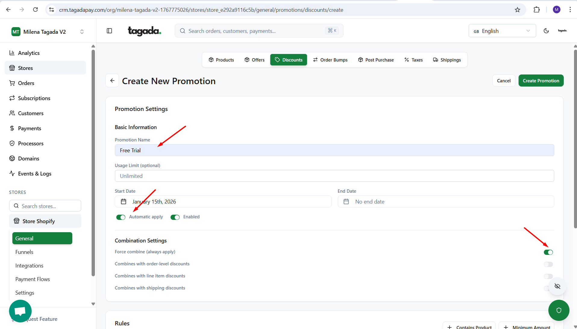 Enter the name of your discount. Select Automatic apply and Force combine to make sure it will be active with other discounts as well.