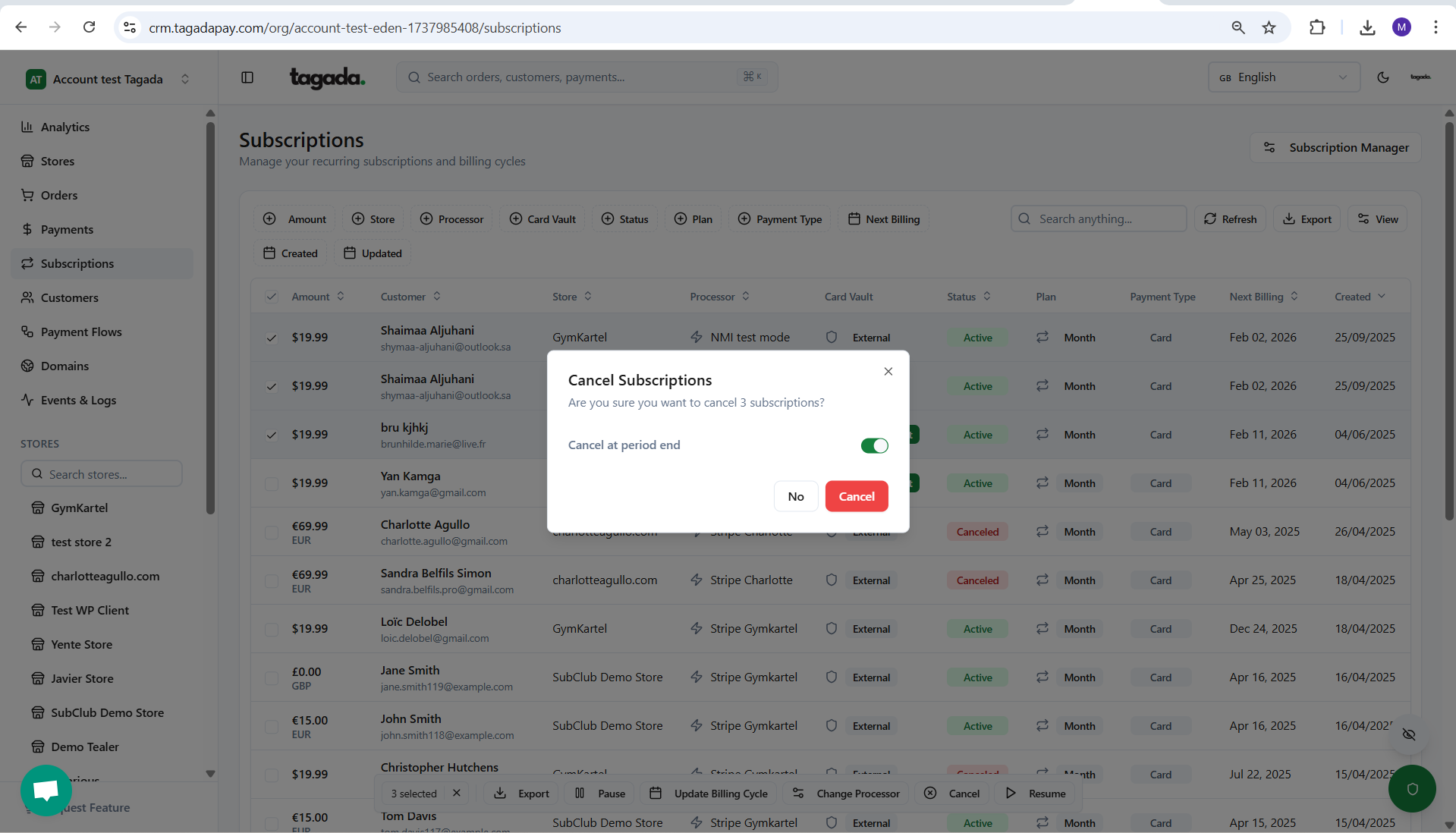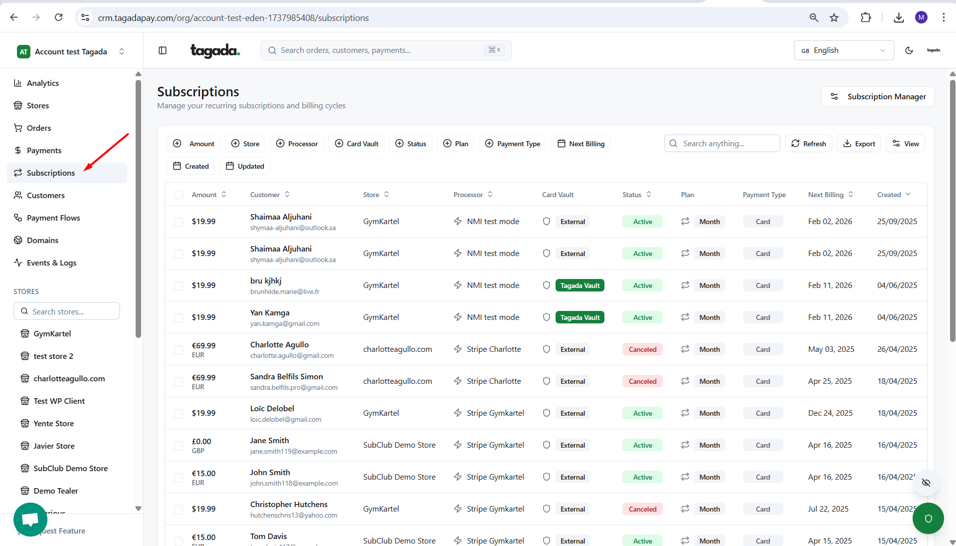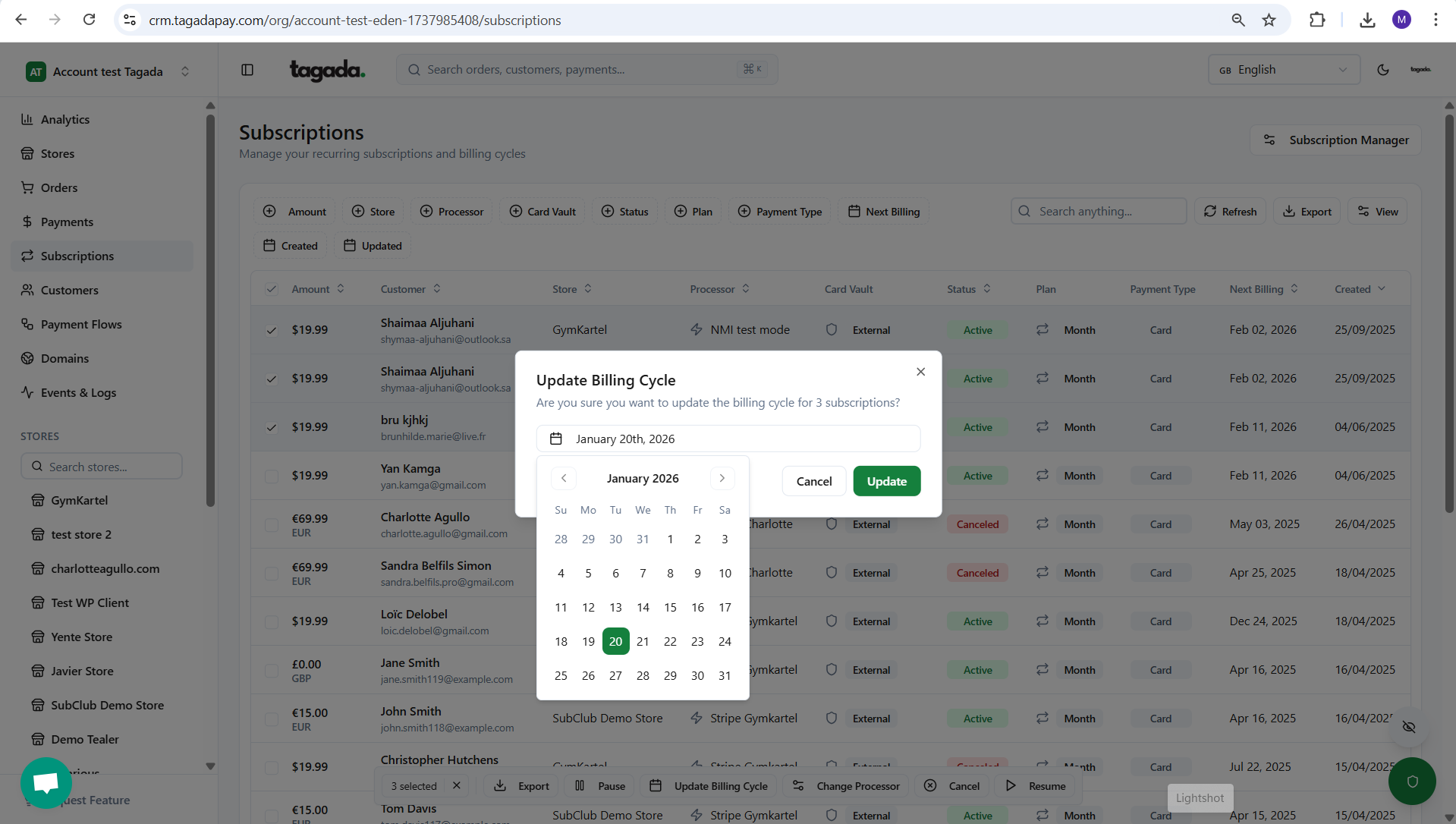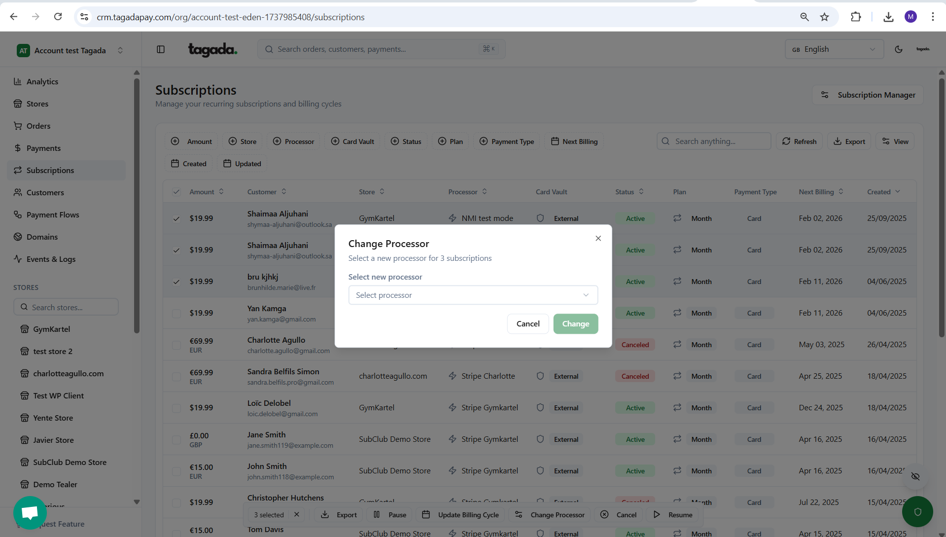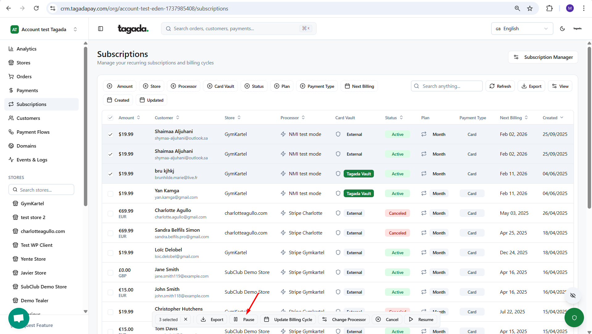 You can manage your subscriptions under the Subscriptions tab in the menu, by chosing whether you would like to Update Billing Cycle, Change Processor, Use TagadaPay Vault, Cancel, Pause or Resume your subscriptions.