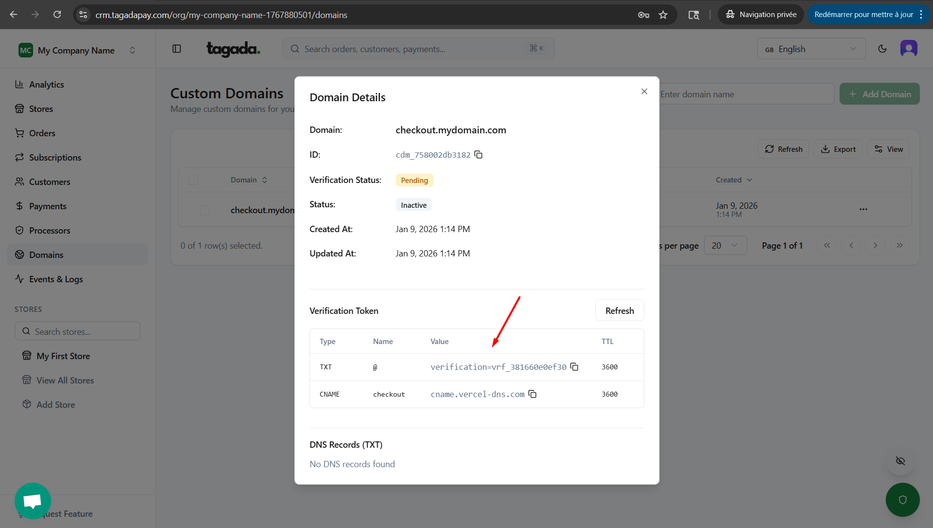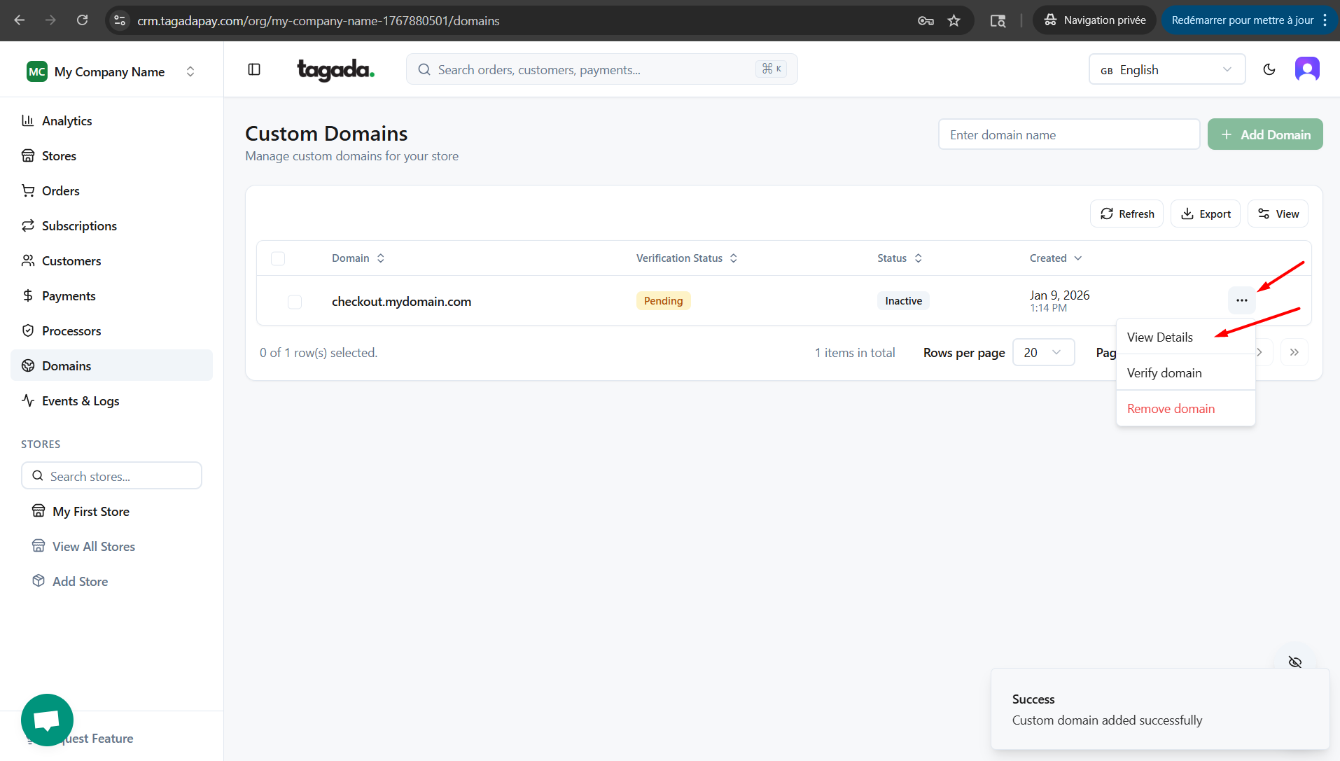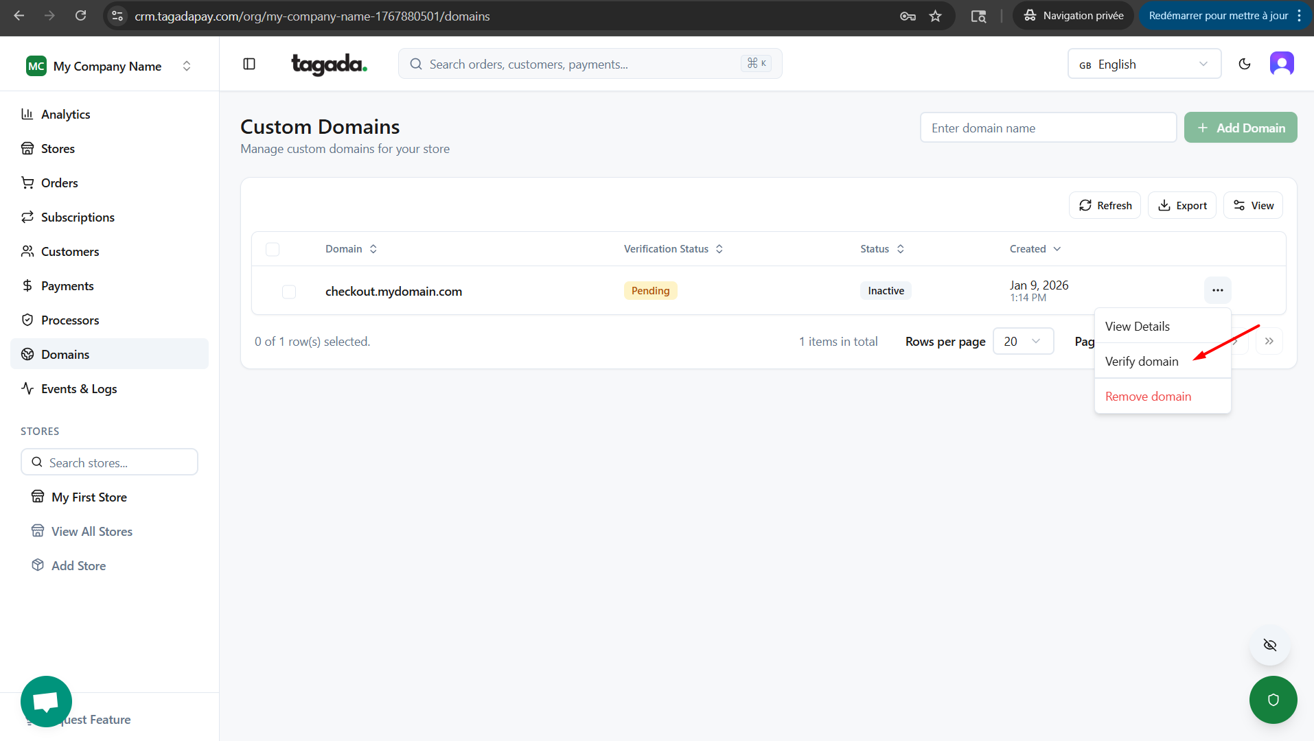 Once you are done with editing the DNS settings with your domain provider, go back to Tagada Admin panel to check the status of your custom domain. If the status is still Pending, you can click on Verify Domain.