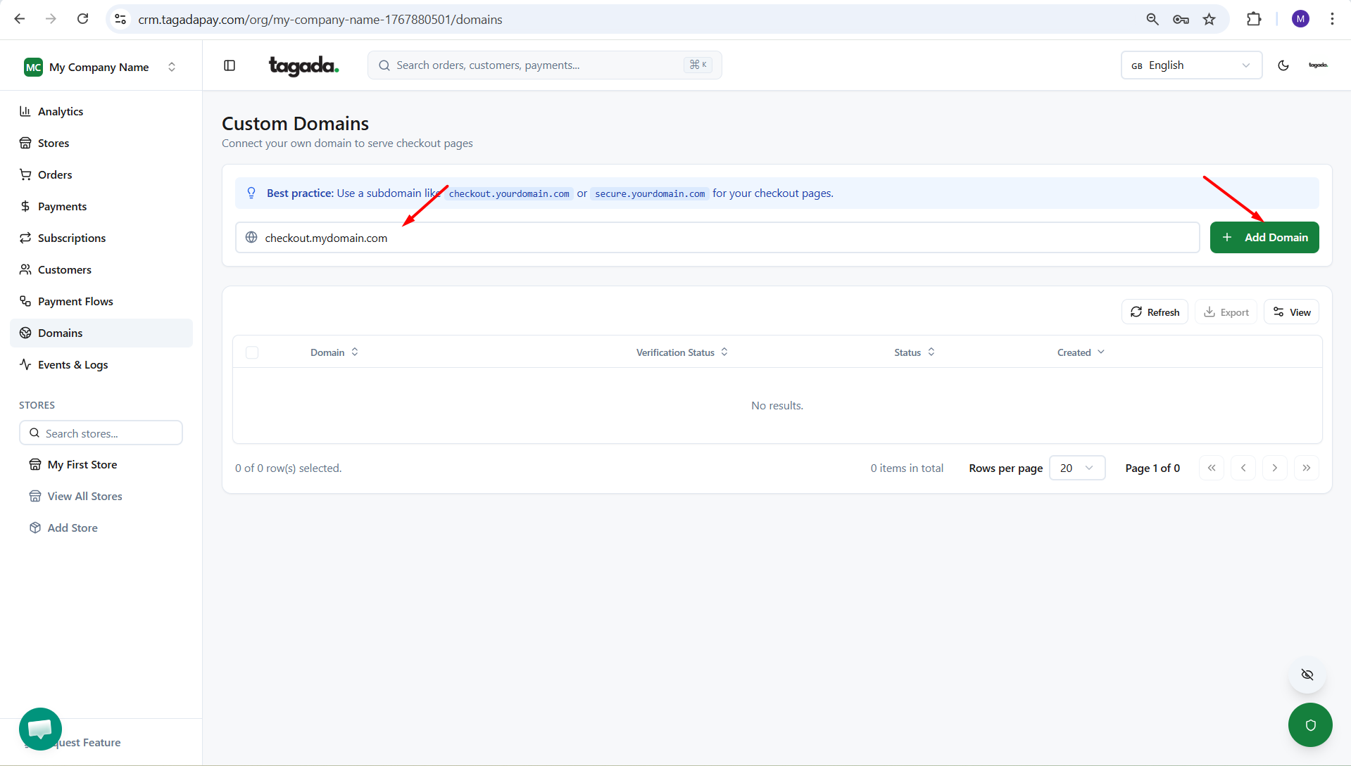 Note: You can only add a subdomain by choosing a custom prefix (for example, checkout.yourdomain.com).