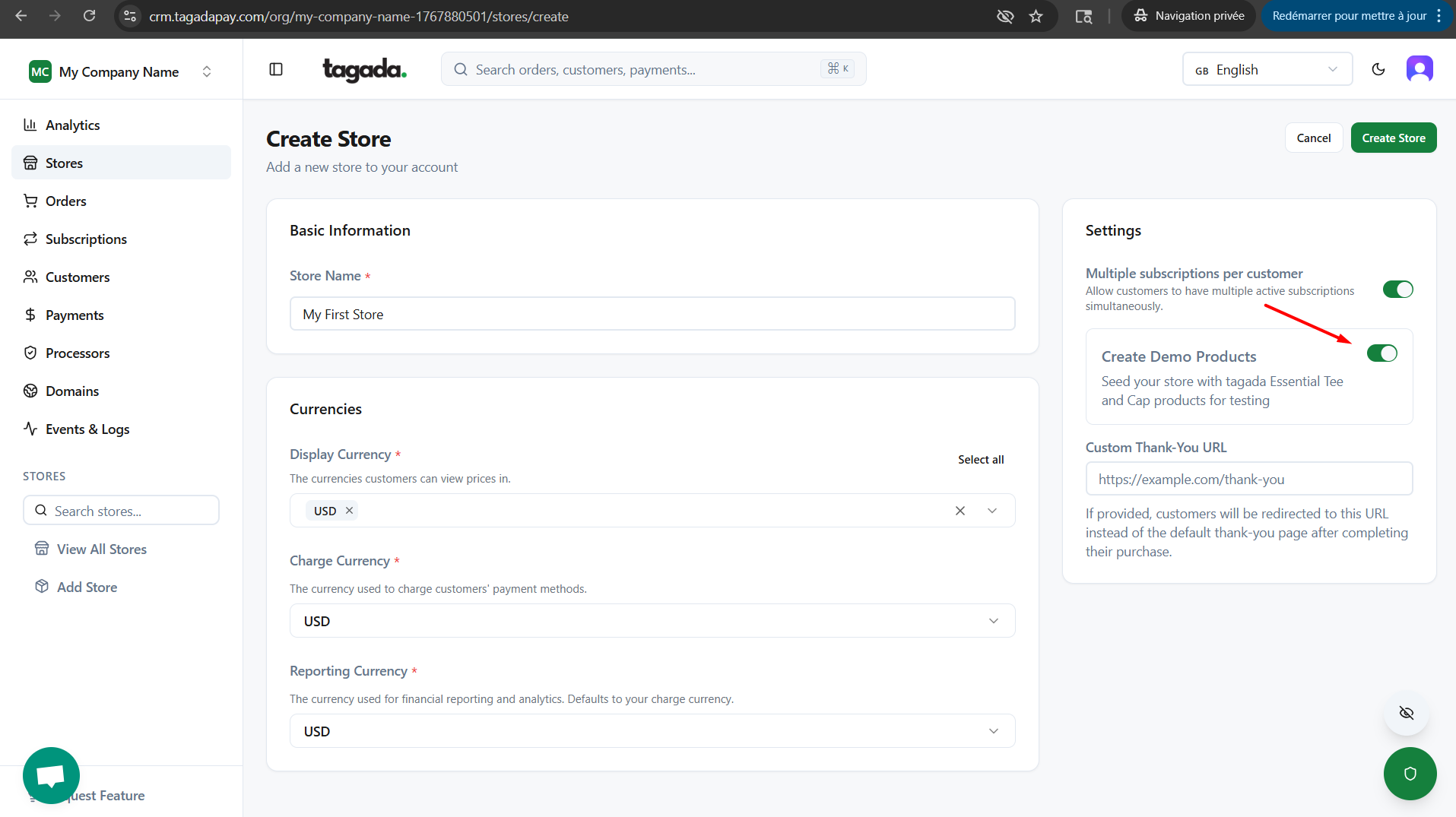 Si vous souhaitez créer des produits de démonstration pour votre boutique à des fins de test, assurez-vous d'activer cette option à cette étape. Cela ajoutera deux produits Tagada à votre boutique.