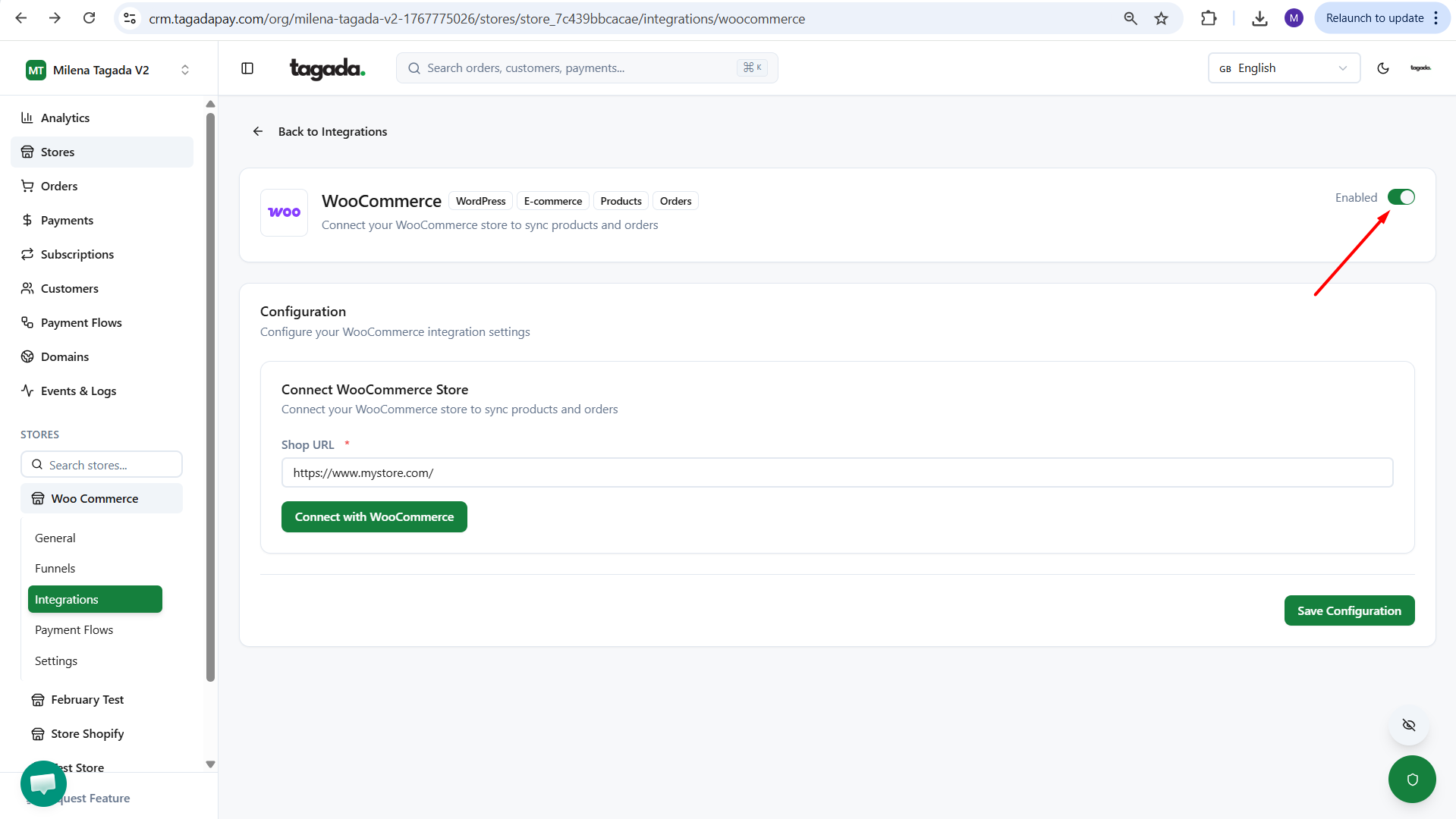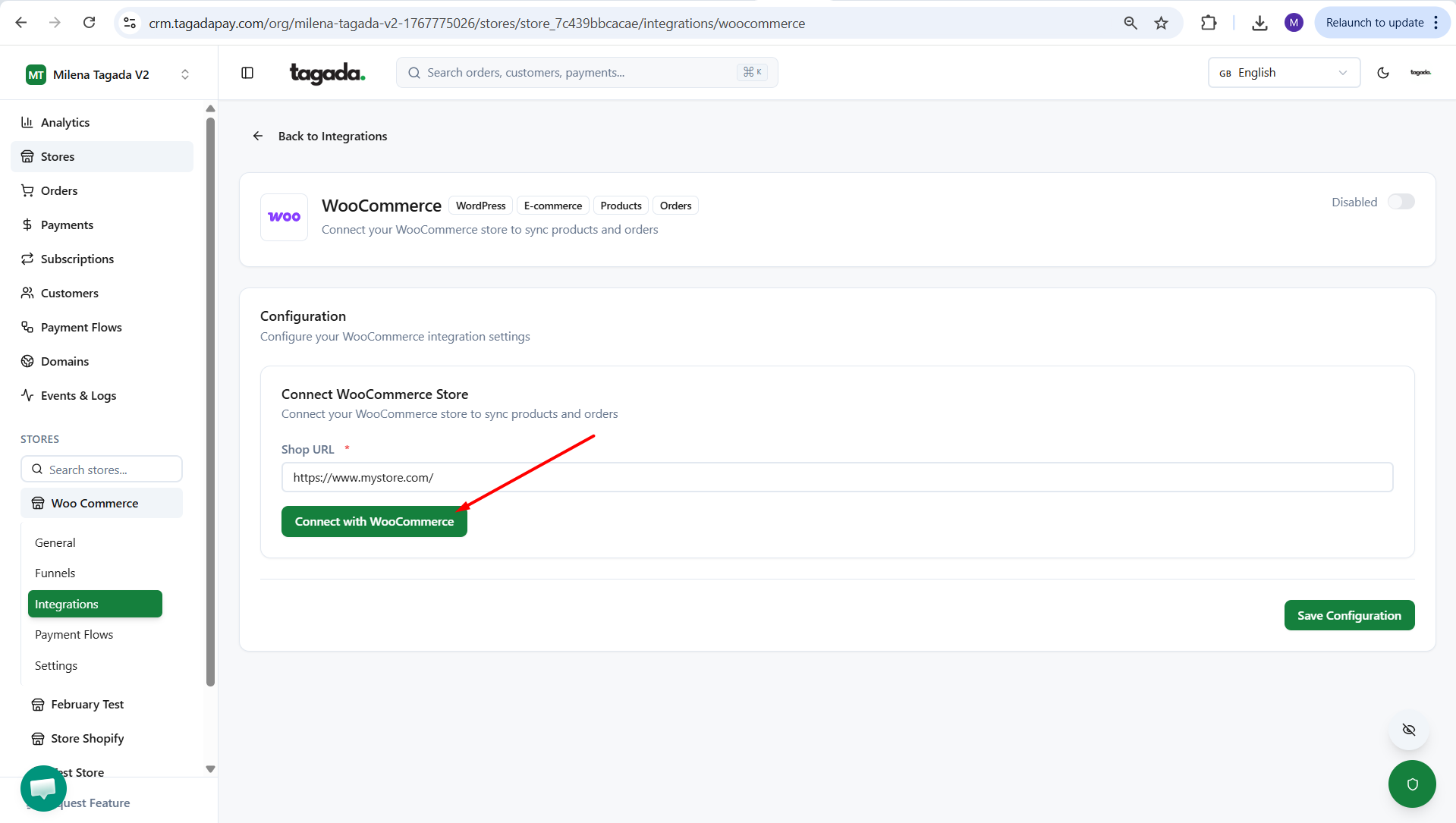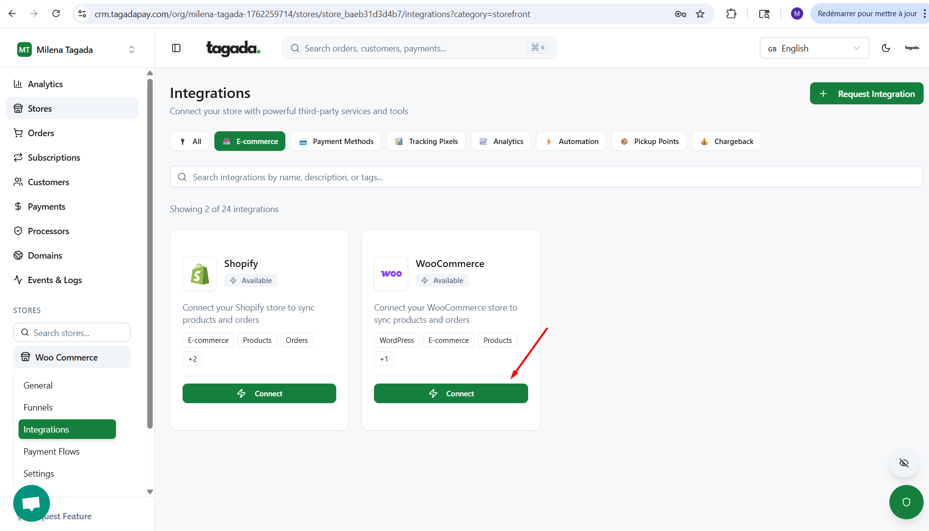 Dans votre compte Tagada, cliquez sur Stores dans le menu de gauche, puis cliquez sur le bouton Add Store.