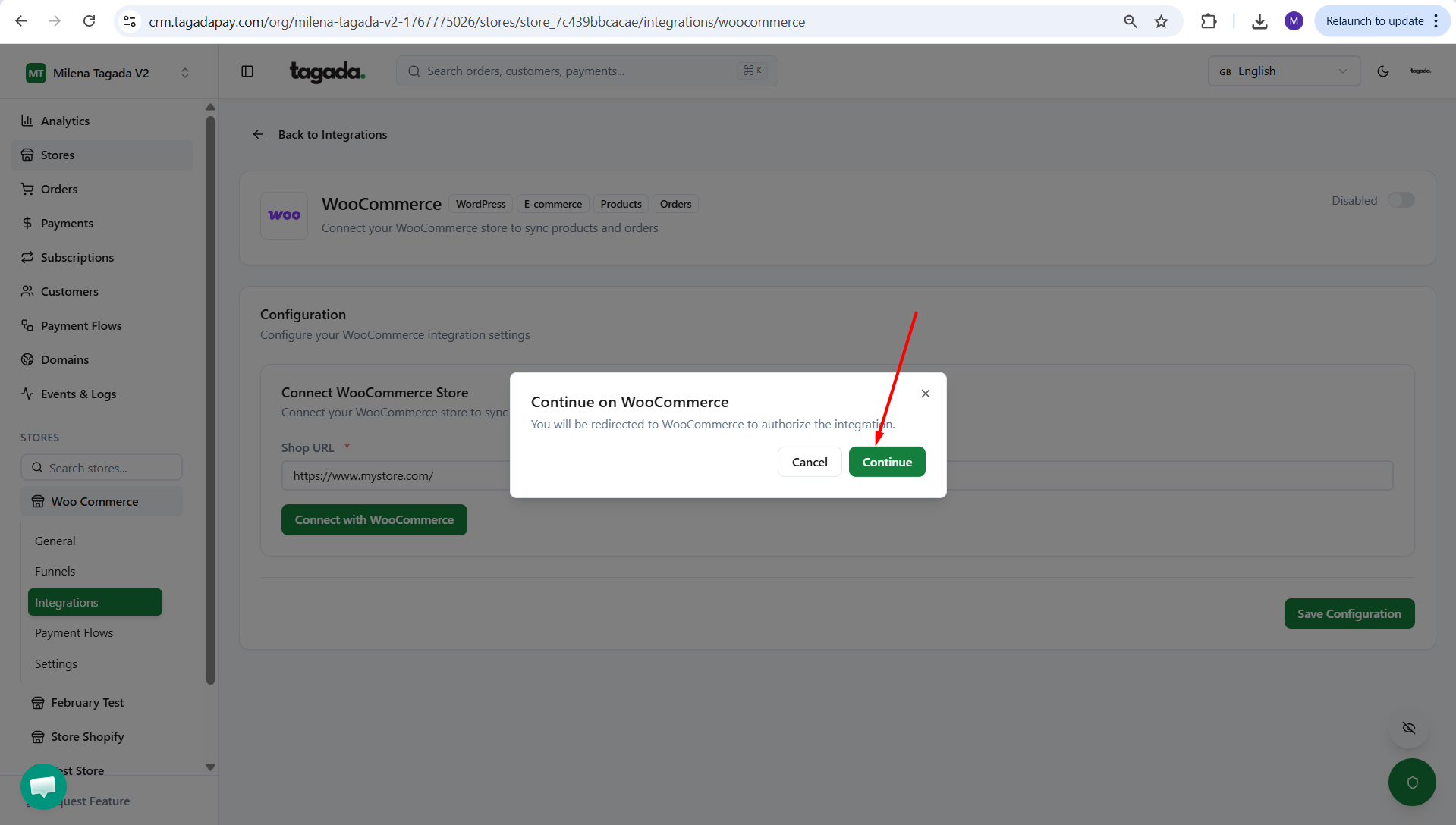 Cliquez sur Continue. Vous serez redirigé vers votre boutique WooCommerce afin d'installer le plugin Tagada.