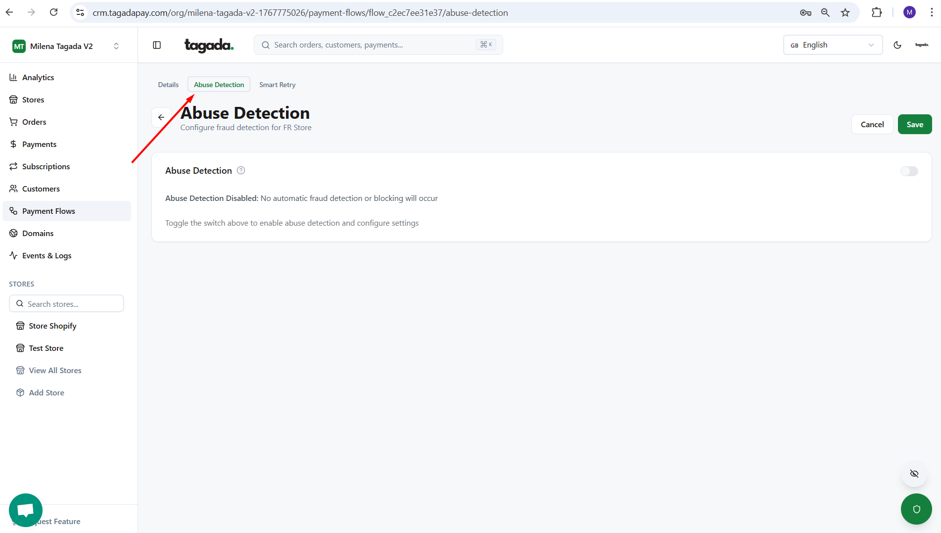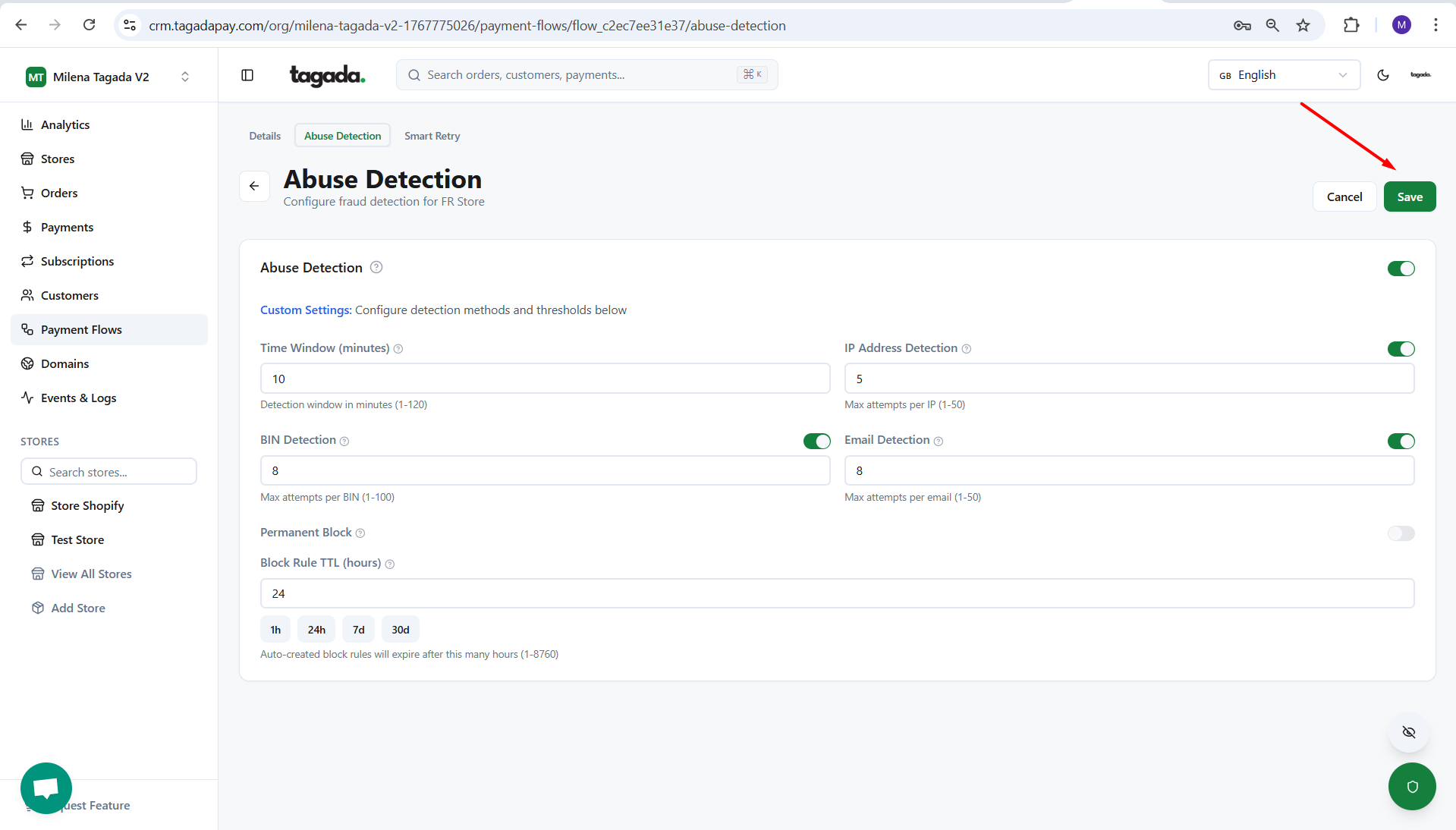 Si vous le souhaitez ou si votre processeur de paiement l'exige, vous pouvez configurer vos paramètres de détection d'abus sur Tagada.