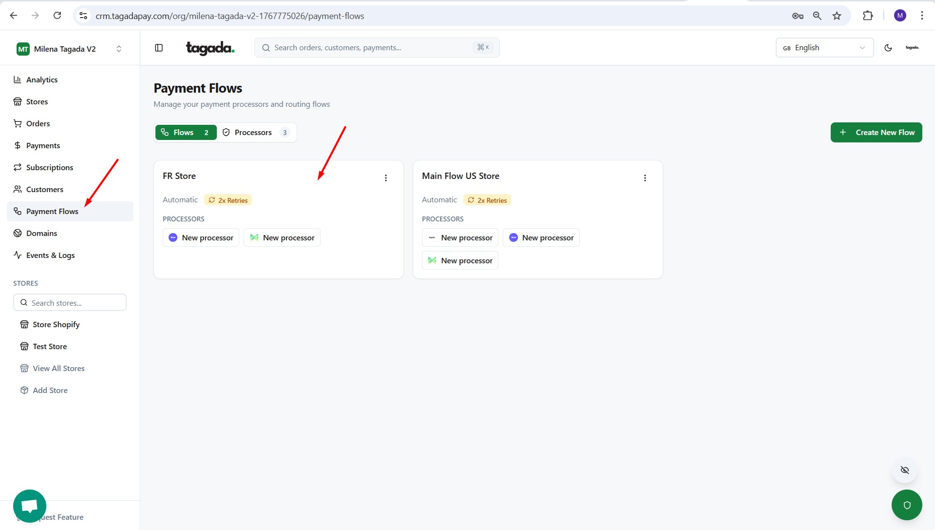 Depuis votre Organization, sélectionnez Payment Flows dans le menu de gauche, puis cliquez sur votre flux pour accéder à ses paramètres.