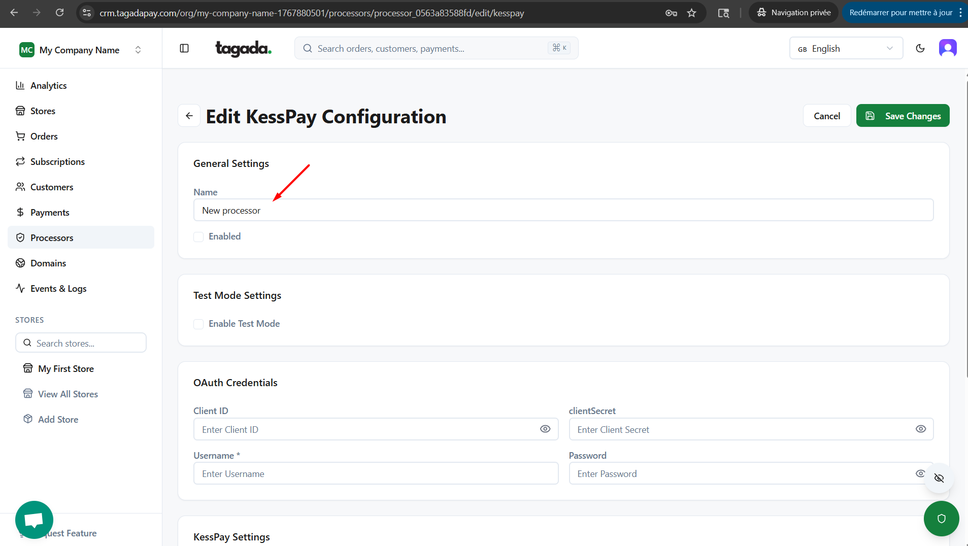 Dans votre Organisation, sélectionnez Flux de Paiement (Payment Flows) dans le menu de gauche, puis sélectionnez l'onglet Processeurs et cliquez sur Ajouter un Processeur (Add Processor).