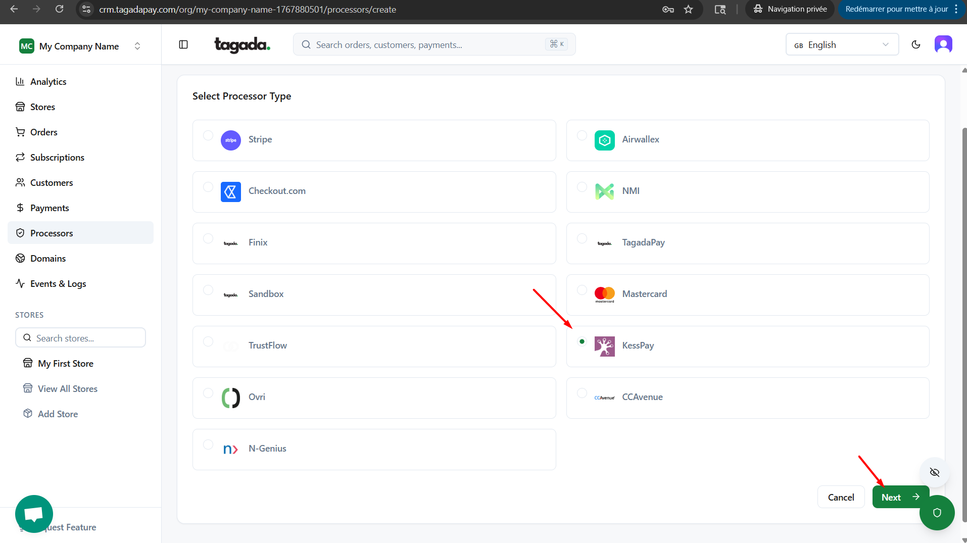 Sélectionnez KessPay. Cliquez sur Suivant (Next).