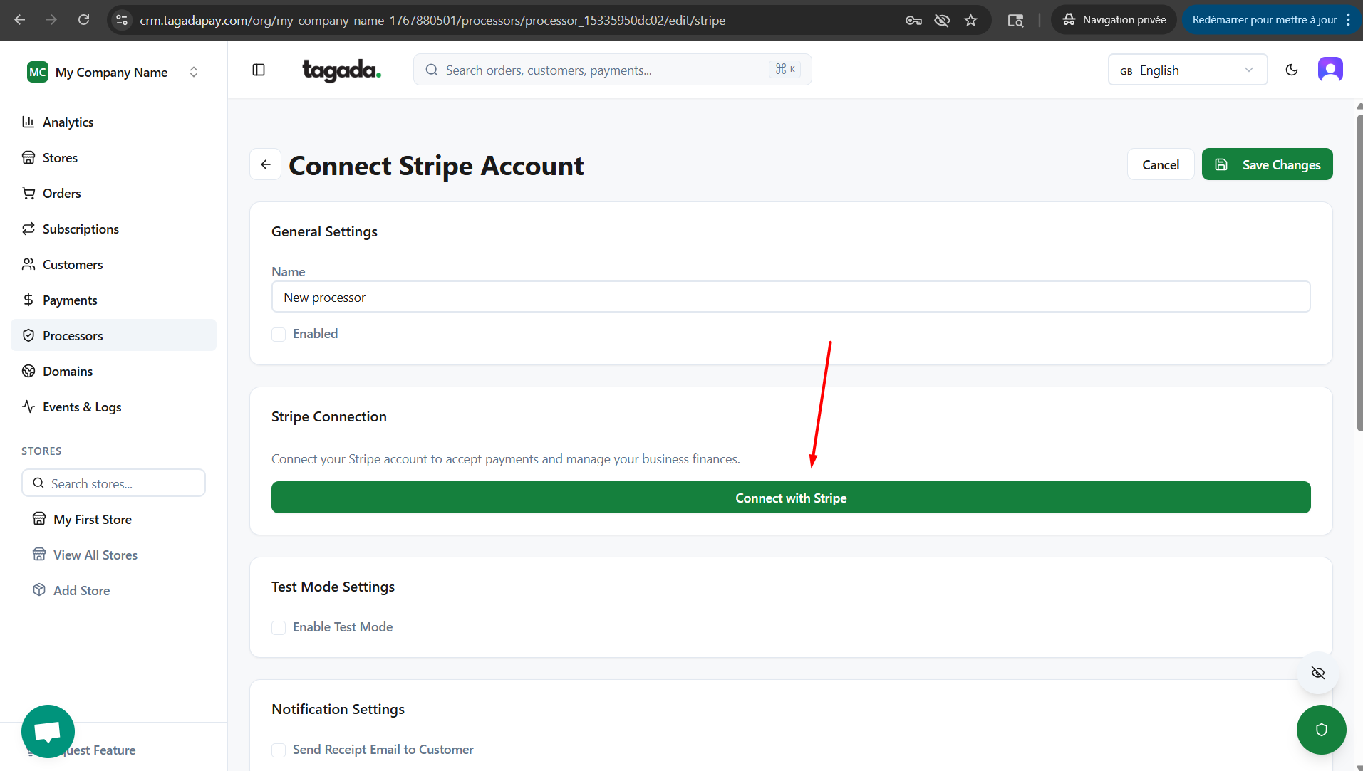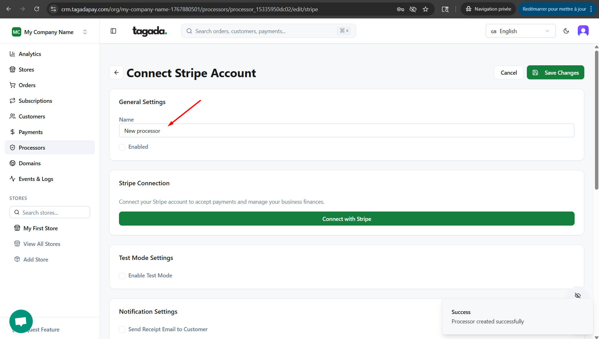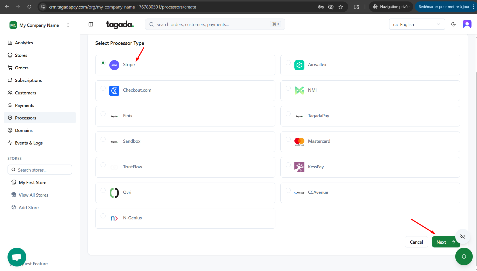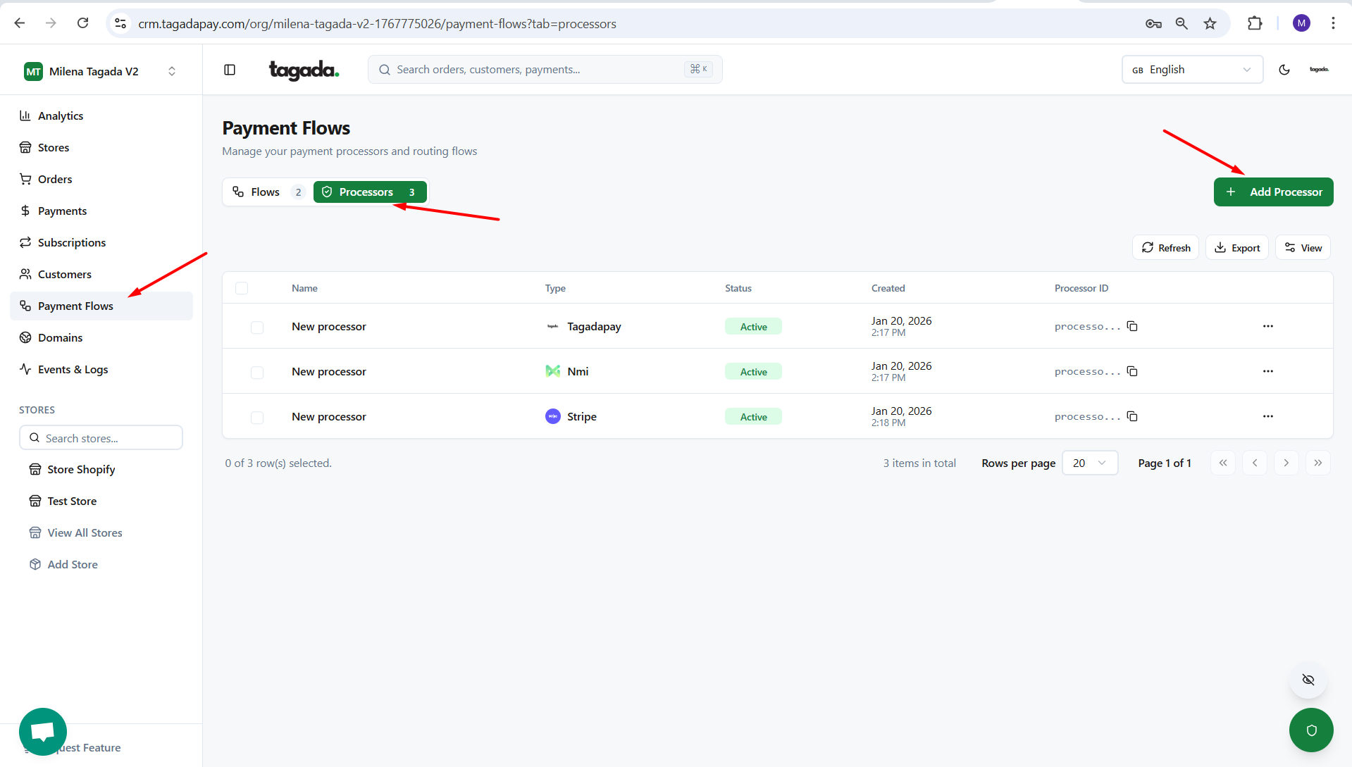 Dans votre Organization, sélectionnez Payment Flows dans le menu de gauche, puis sélectionnez l'onglet Processors et cliquez sur Add Processor.