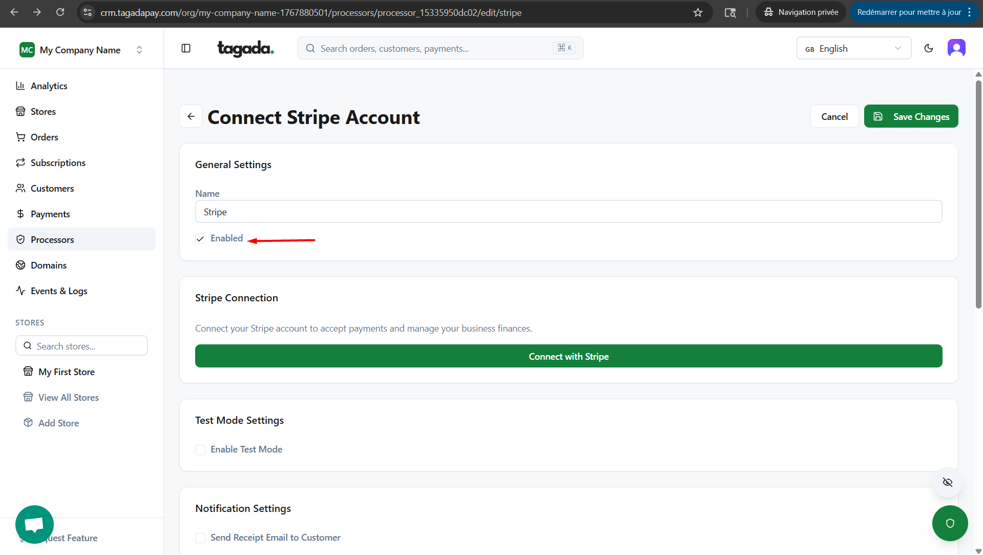 Après la connexion, vous reviendrez sur Tagada. Remplissez tous les champs requis et assurez-vous que la case Enabled est cochée.